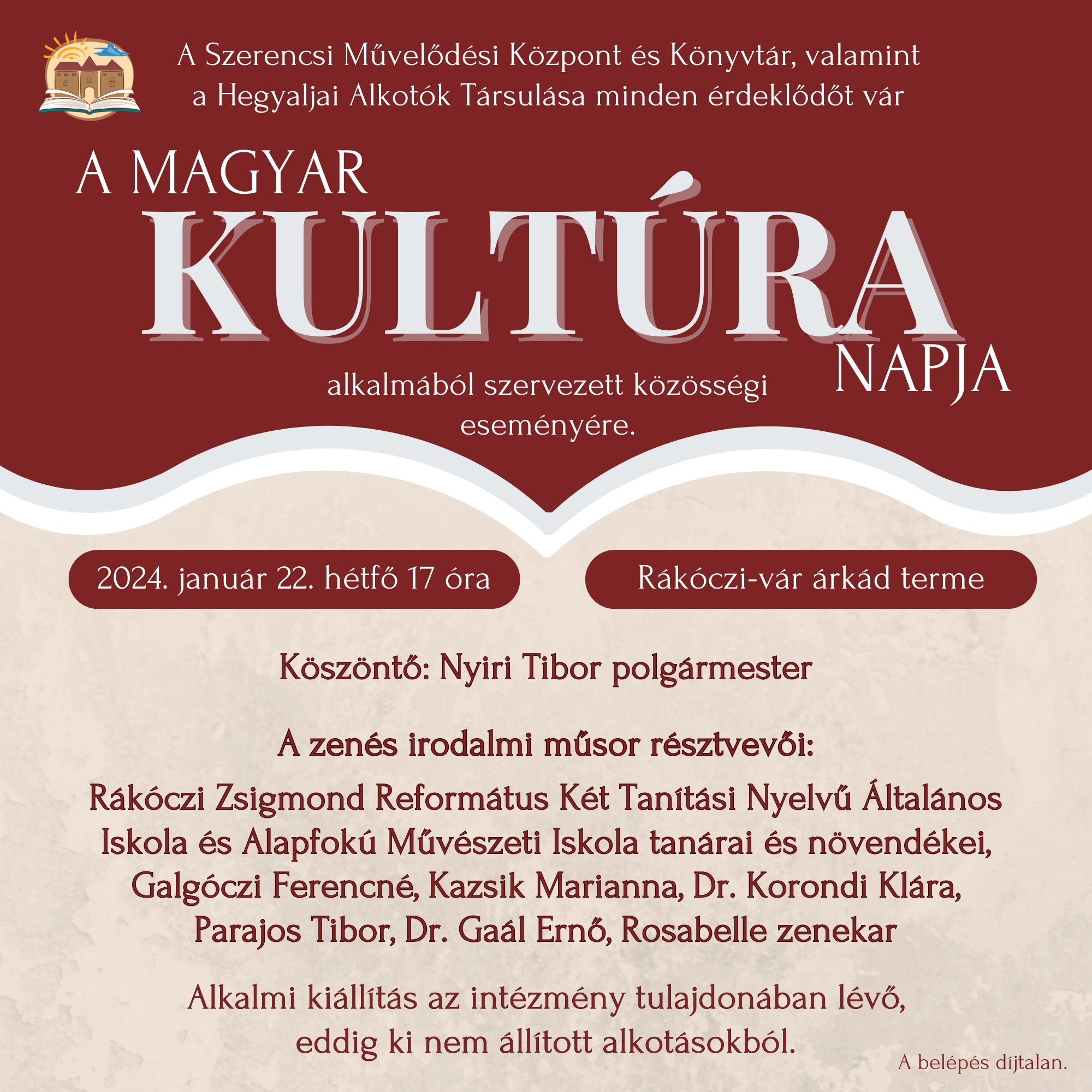 Minden érdeklődőt várnak a magyar kultúra napja alkalmából szervezett zenés irodalmi műsorra 2024. január 22-én, hétfőn 17 órától a Rákóczi-vár árkád termébe.