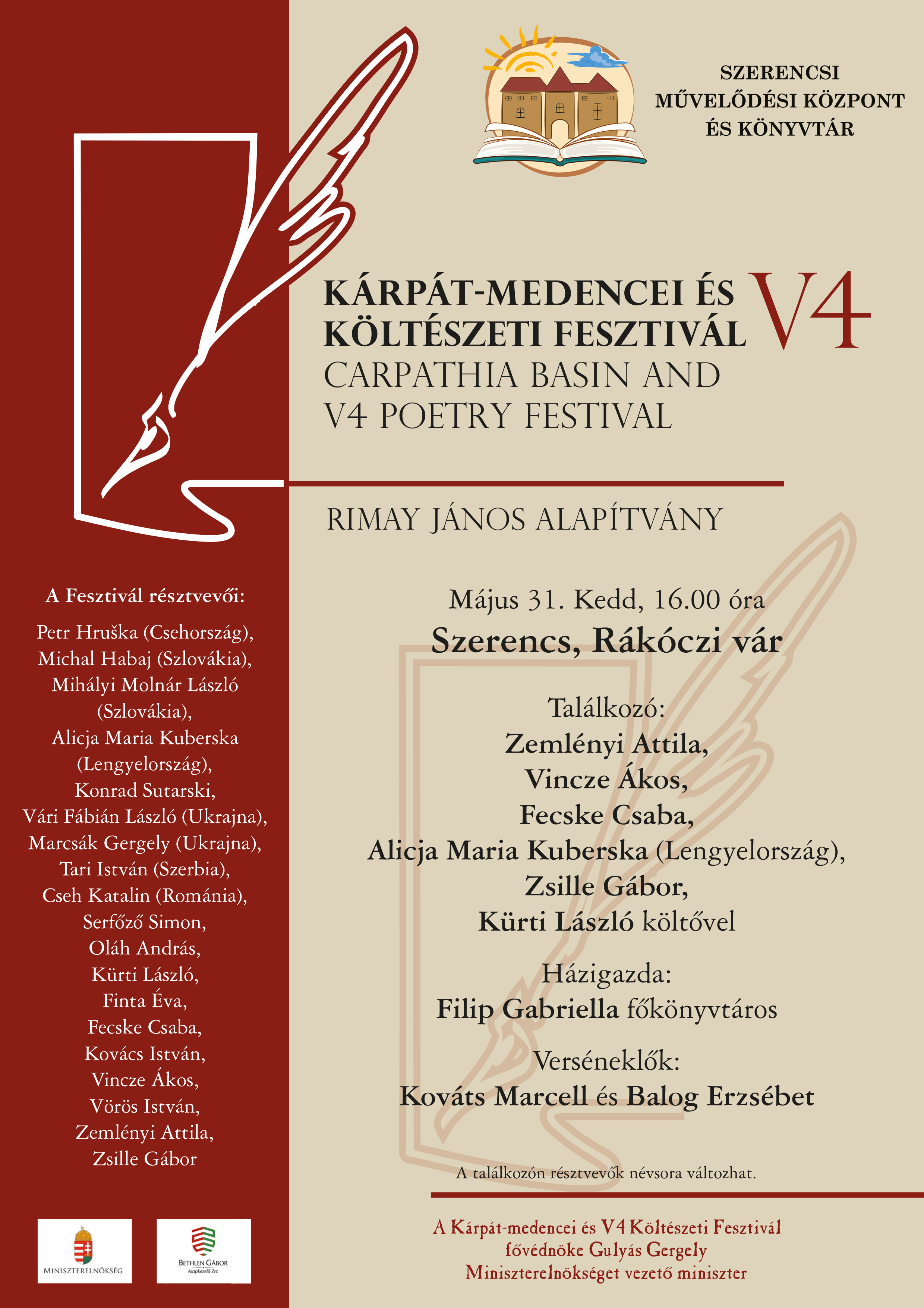 Kárpát-medencei és V4 Költészeti Fesztivál néven szervez több napos találkozót a Rimay János Alapítvány. A fesztivál szerencsi eseményét 2022. május 31-én, kedden 16 órától rendezik a szerencsi Rákóczi-várban, ahol magyar és külföldi költőkkel találkozhatnak az érdeklődők.