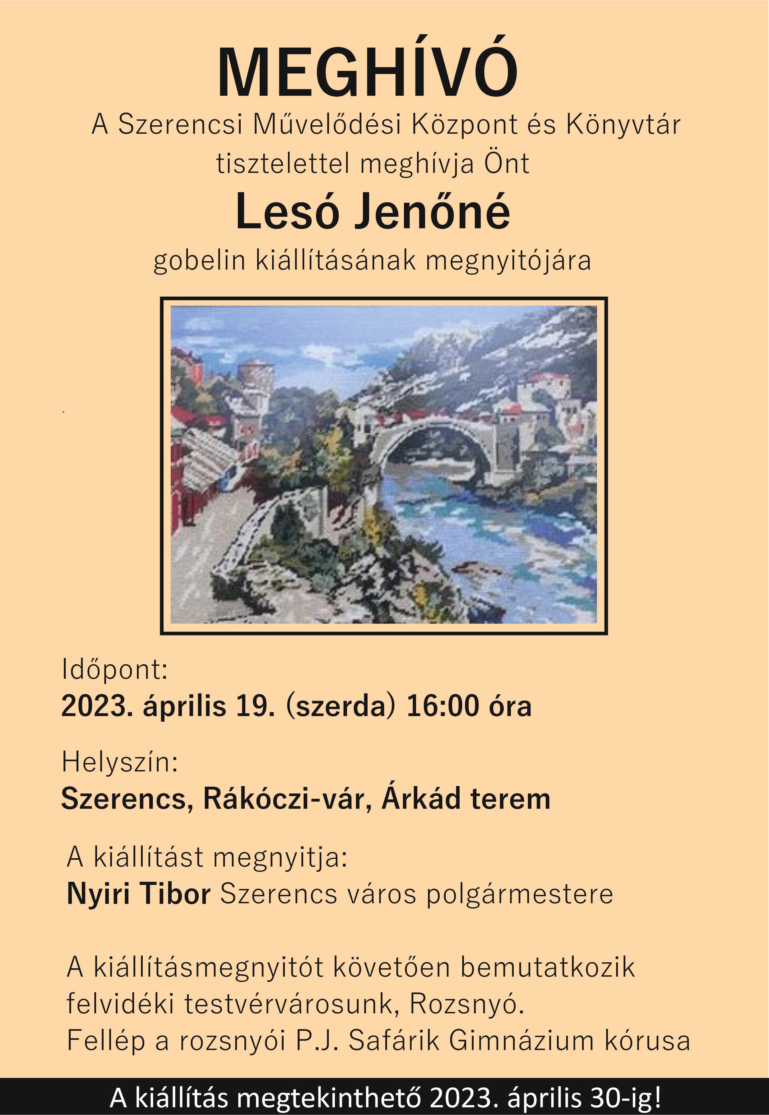 Lesó Jenőné egykori szerencsi lakos által készített gobelinekből nyílik kiállítás 2023. április 19-én, szerdán 16 órától a Rákóczi-vár Árkád termében. A kiállításmegnyitó után Szerencs felvidéki testvérvárosi, Rozsnyó diákjai mutatkoznak be a színházteremben.
