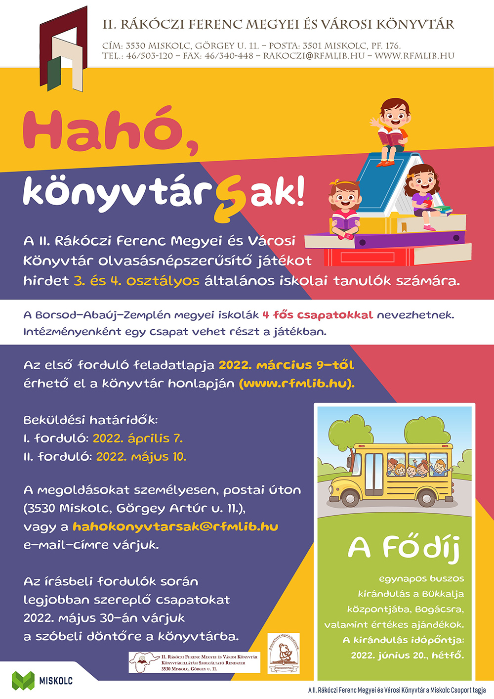 A II. Rákóczi Ferenc Megyei és Városi Könyvtár olvasás-népszerűsítő játékot hirdet 3. és 4. osztályos általános iskolai tanulók számára. A Borsod-Abaúj-Zemplén megyei iskolák 4 fős csapatokkal nevezhetnek. Intézményenként egy csapat vehet részt a játékban.