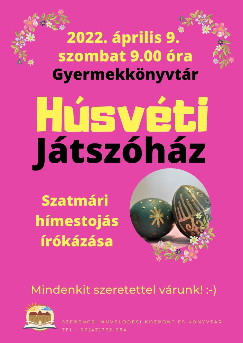 Húsvéti játszóház várja a kedves érdeklődőket 2022. április 9-én szombaton 9 órától a gyermekkönyvtárba. A résztvevők a szatmári hímestojás írókázásának rejtelmeibe nyerhetnek bepillantást, hiszen közeleg a húsvét. Az elkészített tojásokat haza is lehet vinni.