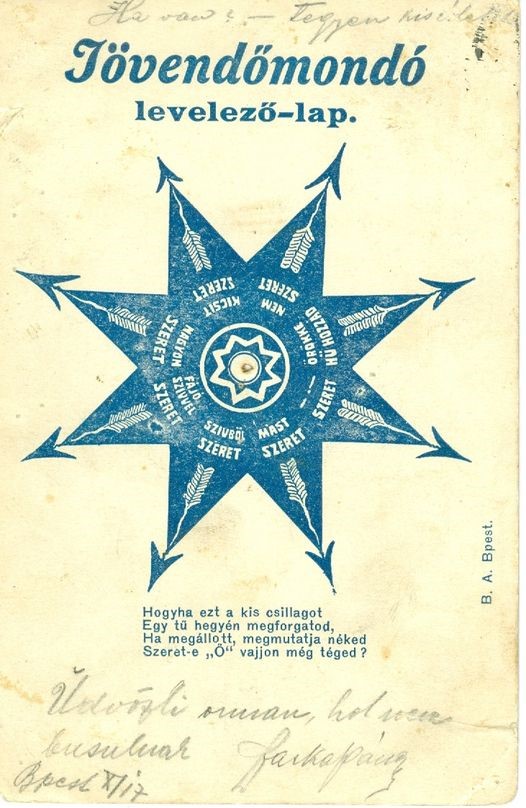 Ezt a különleges képes levelezőlapot 1902. október 16-án adták fel Budapesten. Azt sajnos nem tudjuk, hogy a címzett Kállay Mariska kisasszony a nyomtatott verset követve milyen eredményre jutott.