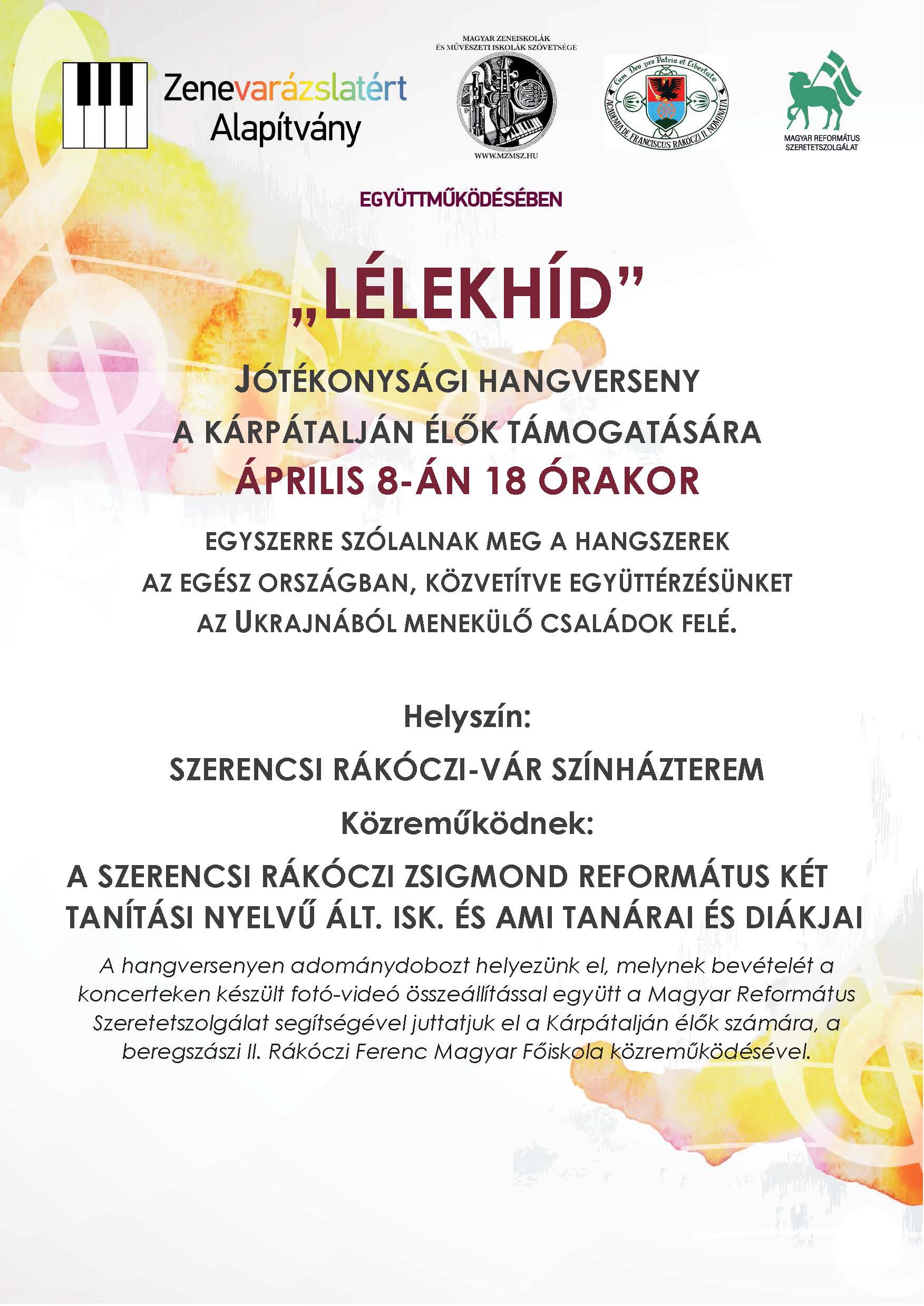 Szerencsi Művelődési Központ és Könyvtár – A Kárpátalján élők megsegítésére tartanak jótékonysági hangversenyt a Rákóczi Zsigmond Református Két Tanítási Nyelvű Általános Iskola és Alapfokú Művészeti Iskola növendékei és tanárai 2022. április 8-án, pénteken 18 órától a szerencsi Rákóczi-vár színháztermében.