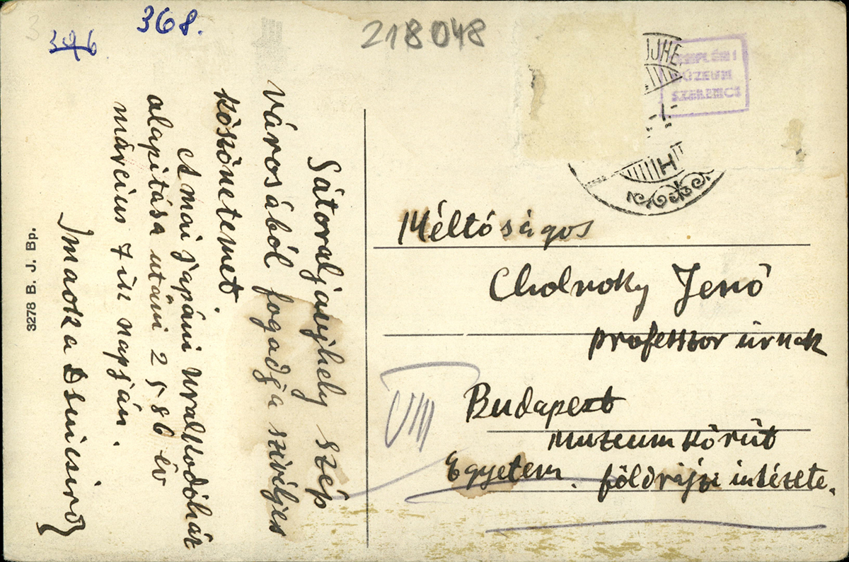 A Zempléni Múzeum képeslap gyűjteményének feldolgozása közben mindig kerülnek elő érdekességek. Ezúttal Rudolfné Varga Valéria kolléganőnk kezébe akadt ez a bélyeg nélküli, sérült bélyegzőjű képeslap, melynek dátumozása a szövegben van rejtve: „Sátoraljaujhely szép városából fogadja szívélyes köszönetemet. A mai japáni uralkodóház alapítása utáni 2586 év március 7ik napján.” A képeslapot méltóságos Cholnoky Jenő professzor úrnak küldték Budapestre a Pázmány Péter Tudományegyetem földrajzi intézetébe. Cholnoky Jenő (1870–1950) a magyar geográfia legnagyobb tudósai közé tartozik, erősen nemzeti érzelmű volt, tudományos kutatásai széles skálán mozogtak, 1921-től a Budapesti Pázmány Péter Tudományegyetem tanszékvezető tanára volt. A képeslap feladója (a múzeumi dolgozó jó barátja a nagyító) Imaoka Dzsúicsiró (1888–1973) japán kutató, aki az 1920-as években kilenc éven át Magyarországon élt. Kiválóan elsajátította a magyar nyelvet, több mint 500 előadást tartott hazánkban, majd Japánban Magyarország szószólója lett, magyar nyelvkönyveket készített a japánok számára. Többek között ő fordította japán nyelvre Madách Imre: Az ember tragédiája című művét. Kapcsolatban állt a magyar társadalom több jeles képviselőjével, így Cholnoky Jenővel.