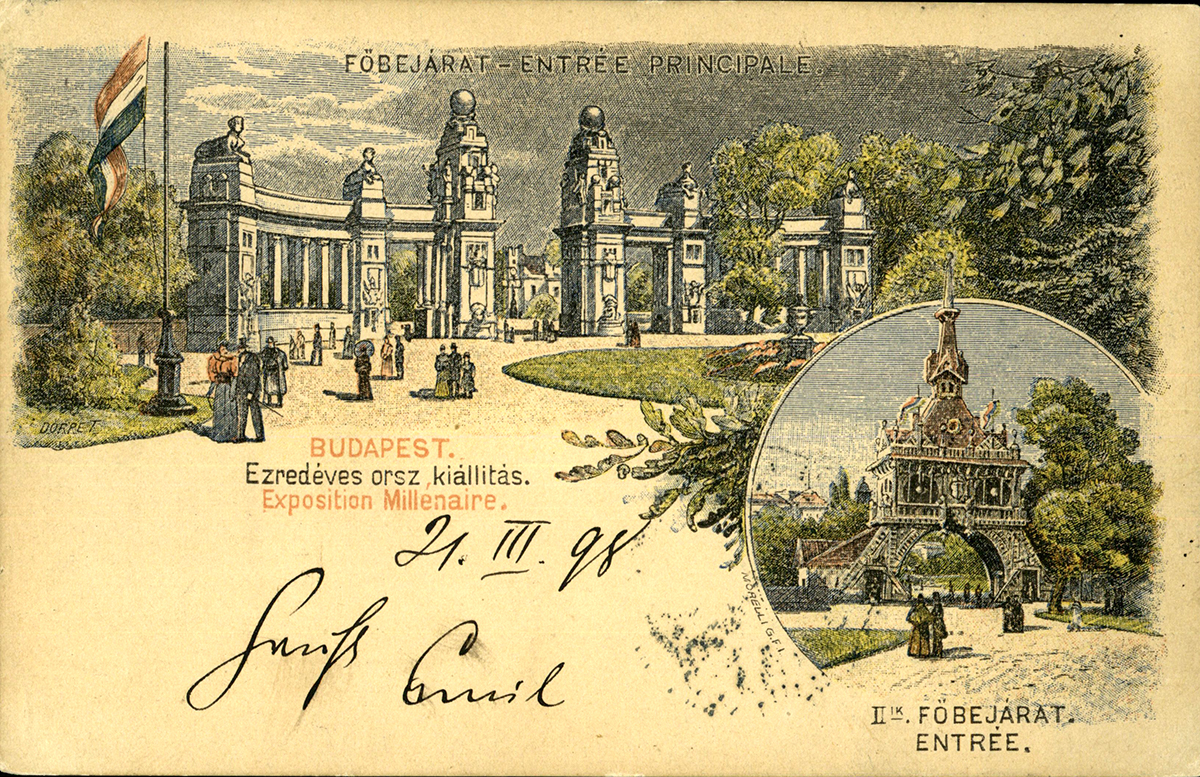 A Magyar Posta bélyegén az ezredéves kiállítás főbejáratáról kiadott képeslap látható, melyet 1898. március 21-én adták postára.