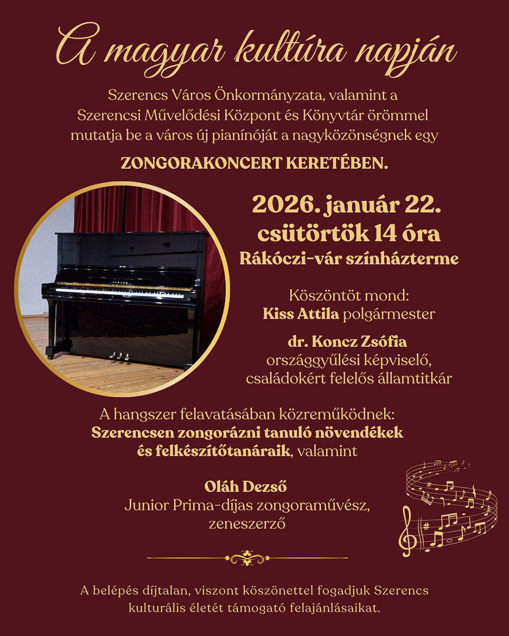 Zongorakoncert a magyar kultúra napja alkalmából, a város új pianínójának felavatása.