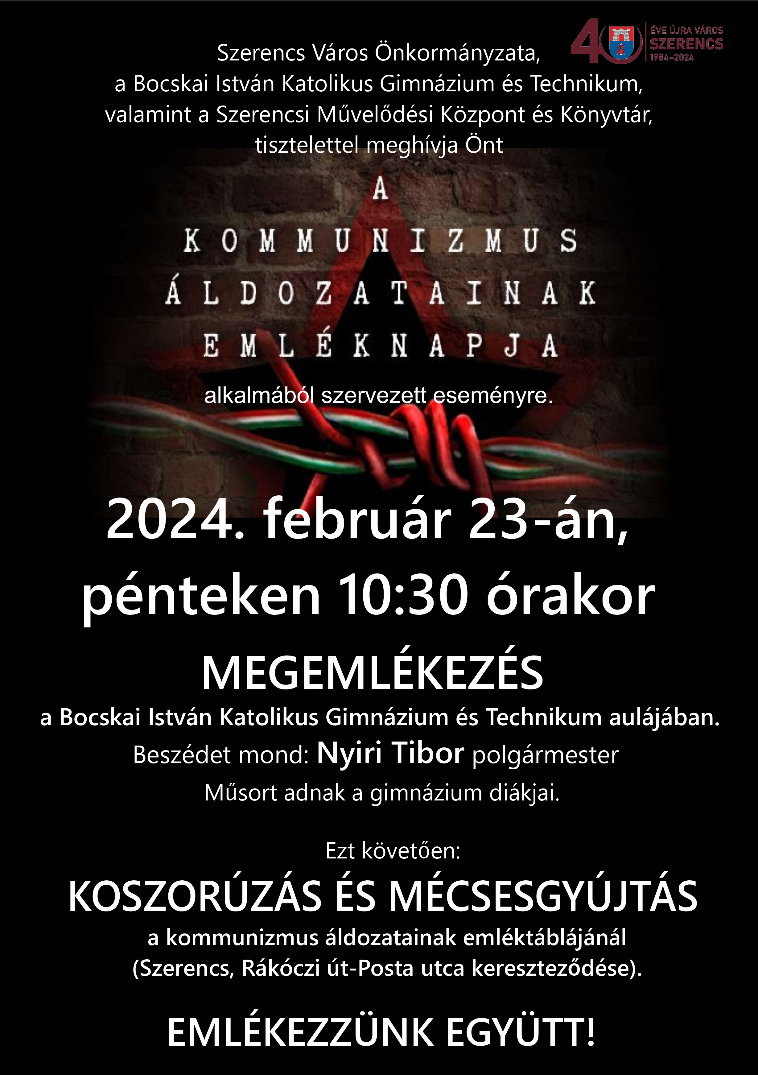 2024. február 23-án, pénteken 10.30 órától előbb a gimnázium aulájában adnak műsort a gimnazisták, majd a Posta utcai emléktáblánál hajtanak fejet és gyújtanak mécsest a megemlékezők.