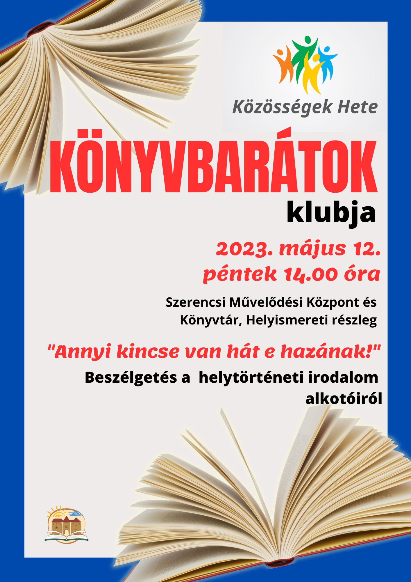 2023. május 12-én pénteken 14.00 órától várjuk a Könyvbarátok klub foglalkozására a könyvet szerető, olvasni vágyó embereket, “Annyi kincse van hát e hazának” címmel. Beszélgetés a helytörténeti irodalomról és az alkotókról.