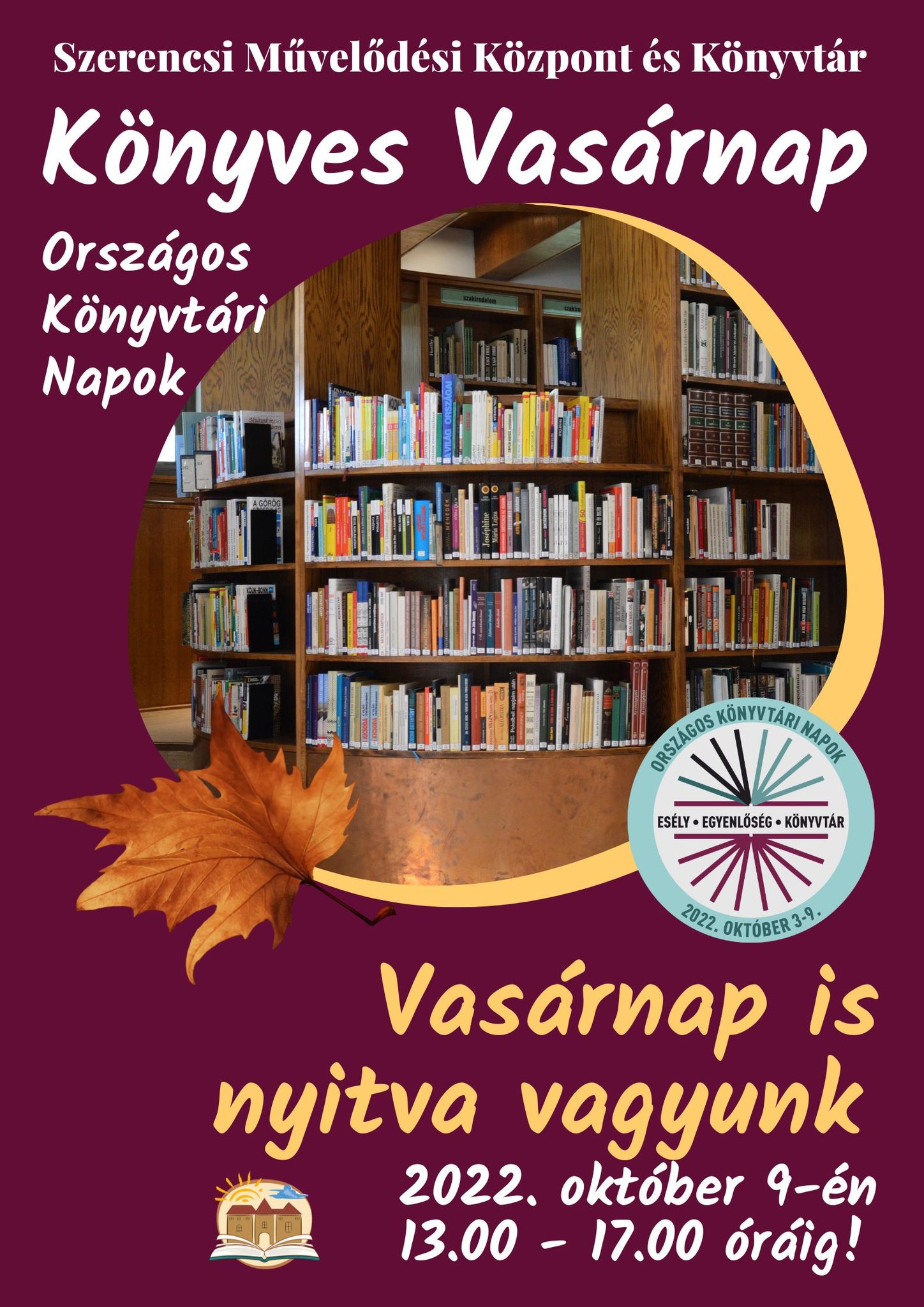 Könyves Vasárnap: ez az elnevezés már nagyon-nagyon régóta azt jelenti, hogy az Országos Könyvtári Napok keretében vasárnap is látogatható a könyvtár 13 -17 óra között.