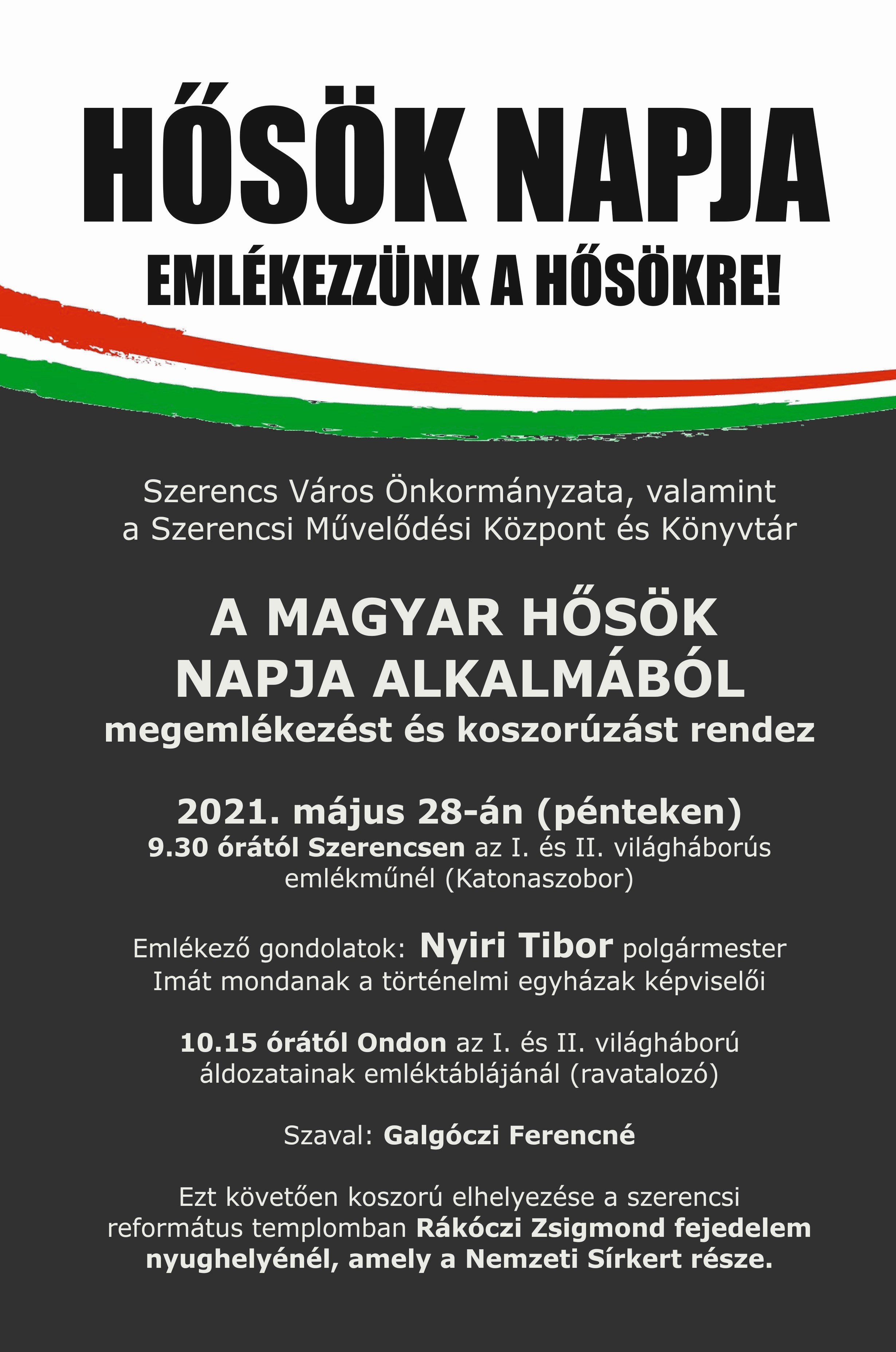 A magyar hősök napja alkalmából megemlékezést és koszorúzást szervez Szerencs Város Önkormányzata, valamint a Szerencsi Művelődési Központ és Könyvtár 2021. május 28-án, pénteken 9.30 órától Szerencsen, majd Ondon.