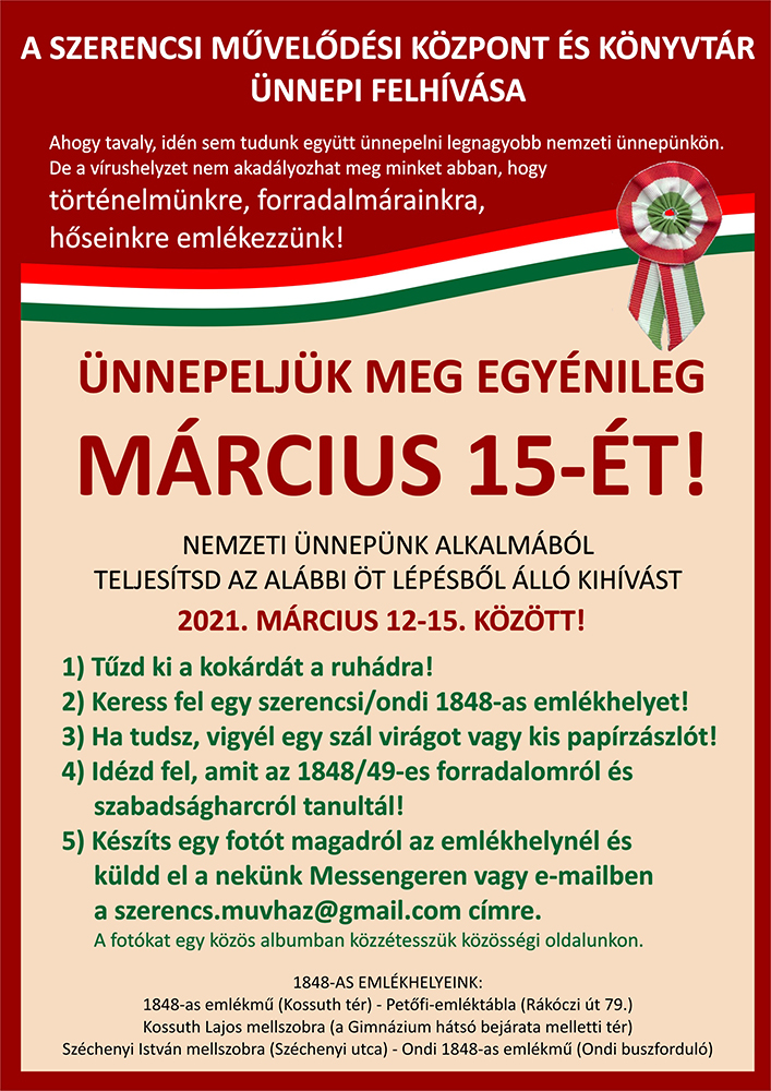 A Szerencsi Művelődési Központ és Könyvtár felhívást tett közzé a 2021. március 15-i nemzeti ünnepünk egyéni megünneplésére.