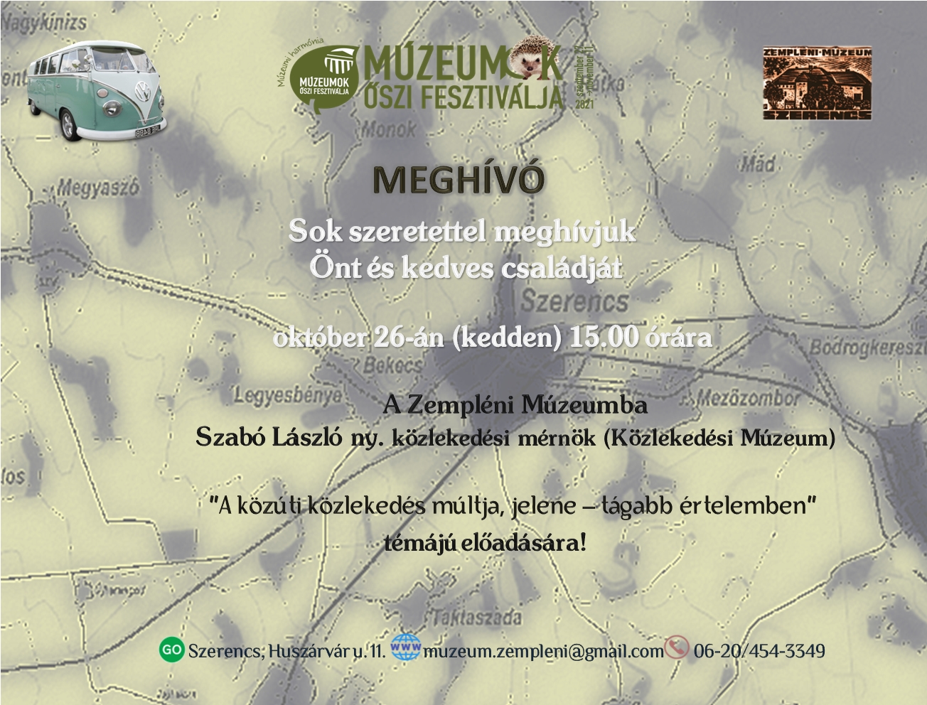 Szeretettel meghívjuk Önöket a Zempléni Múzeumba 2021. október 26-án (kedden) 15 órára Szabó László közlekedési mérnök előadására, amely a közlekedés múltjával, jelenével foglalkozik. Várjuk Önöket!