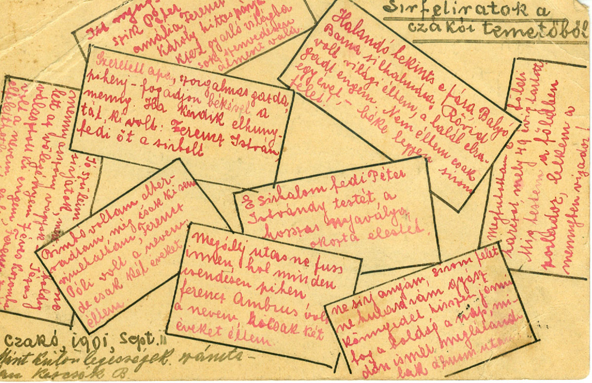 A lap készítője (aláírása alapján: B.) ellátogatott Cakó község (Gömör-Kishont vármegye) temetőjébe és a számára legérdekesebbnek tartott sírfeliratokat piros tintával felírta és fekete kerettel bekeretezte egy képes levelezőlap méretű papíron, ellátta „Sirfeliratok a czákói temetőből” címmel és Czakó 1901. szeptember 2-i keltezéssel. „Mint különlegességek. Számtalan kézcsók B.” szöveggel küldte el a címzettnek. Sajnos a küldő sírfelirat-válogató szempontjai és célja, a címzett reakciója az üdvözletre, a kettejük közötti viszony nem rekonstruálható, mindenesetre ízelítőt ad abból, hogy a századfordulón mennyi mindent jelentett a mindennapi kommunikációban az illusztrált lap és bepillantást nyújt a Zempléni Múzeum gyűjteményének sokszínűségébe.