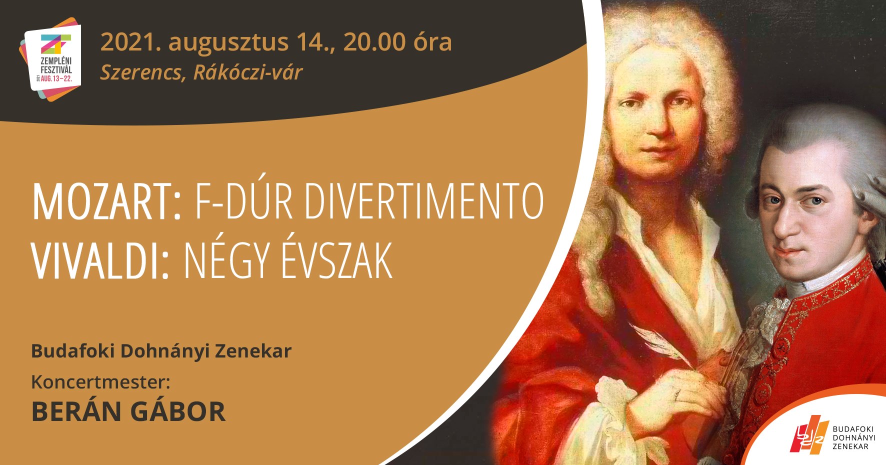 A Budafoki Dohnányi Zenekar hangversenye 2021. augusztus 14-én, szombaton, 20 órától a szerencsi Rákóczi-vár udvarán. Szabadtéri rendezvény. (Rossz idő esetén a színházteremben.)