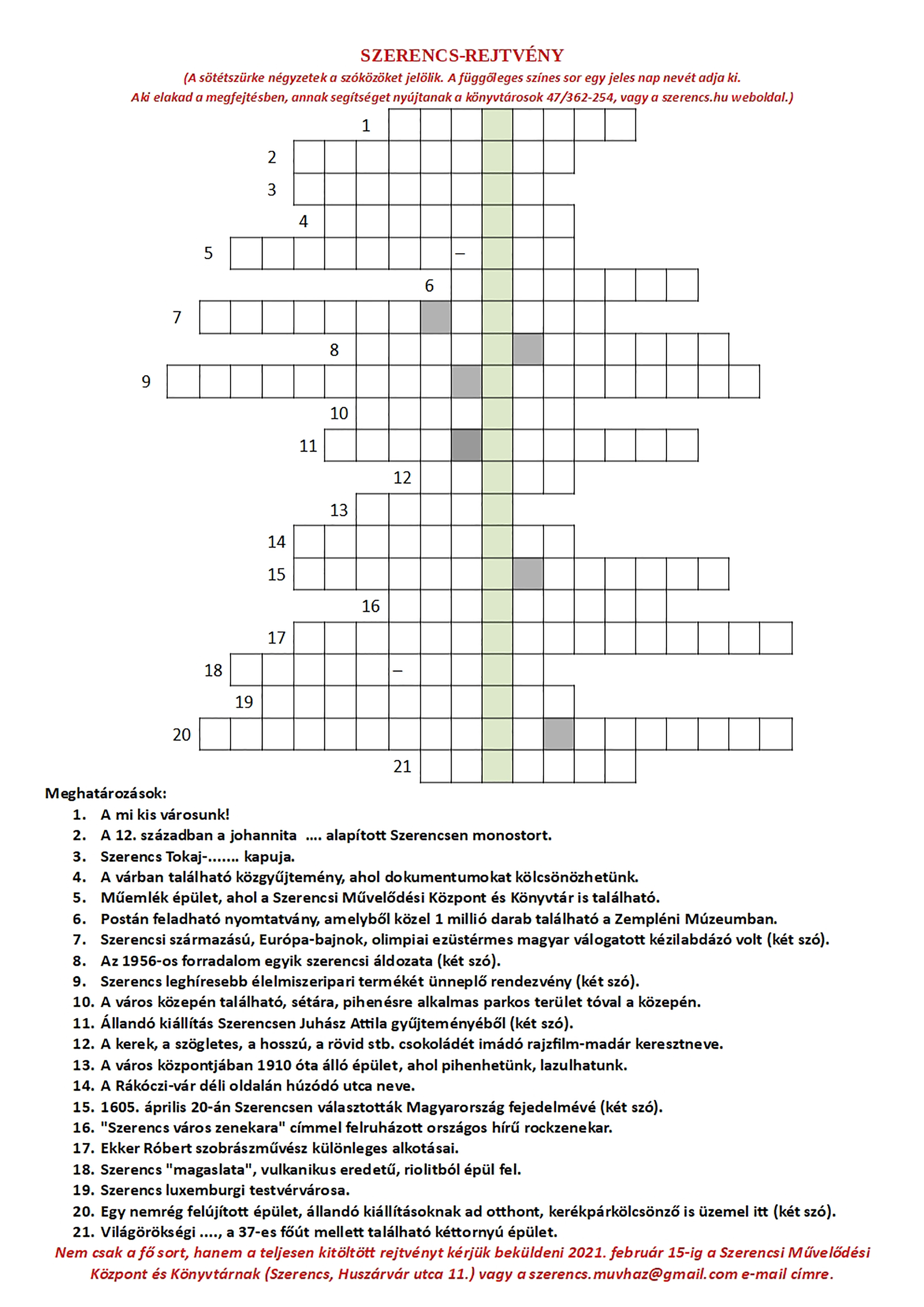 Helyismereti rejtvényt tett közzé a Szerencsi Művelődési Központ és Könyvtár, amelyre 2021. február 15-ig várják a megfejtéseket. A helyes megfejtők között tárgyjutalmakat sorsolnak ki.
