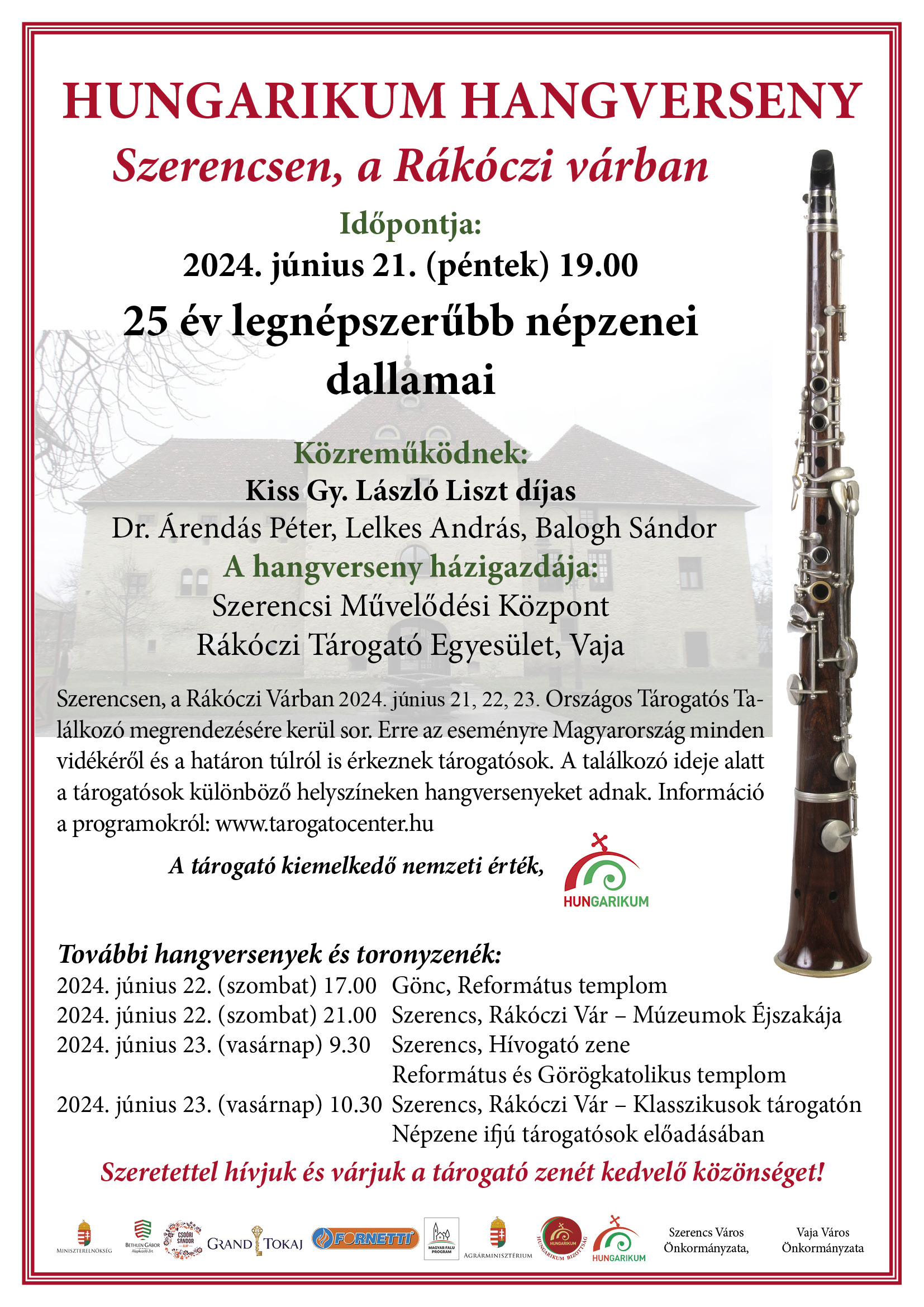 A hangverseny házigazdája: Szerencsi Művelődési Központ és Könyvtár, valamint a Rákóczi Tárogató Egyesület, Vaja.