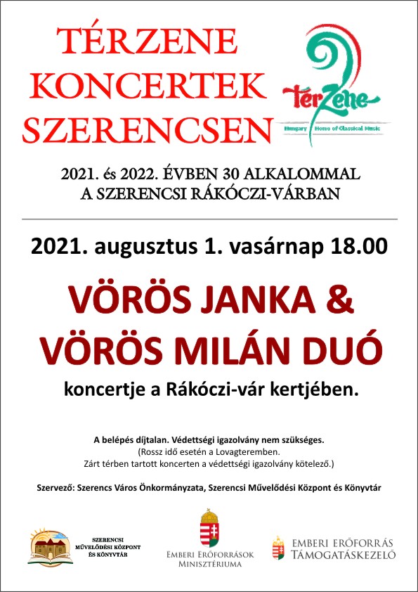 A Vörös Janka&Vörös Milán Duó koncertjével folytatódik a térzene sorozat a szerencsi várban 2021. augusztus 1-jén, vasárnap 18 órától.