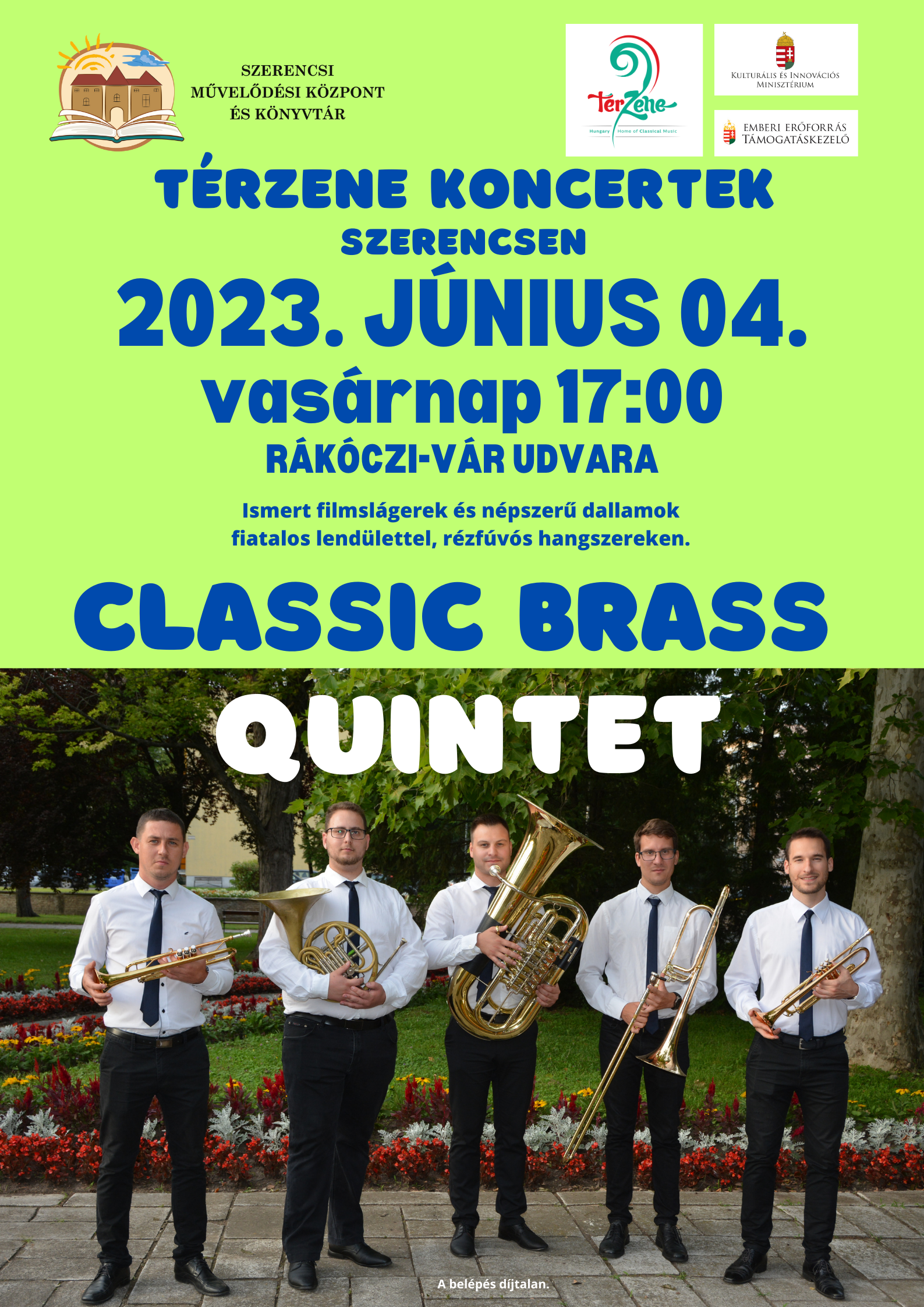 A Classic Brass Quintet ad koncertet a térzene sorozatban 2023. június 4-én, vasárnap 17 órától a Rákóczi-vár udvarán.