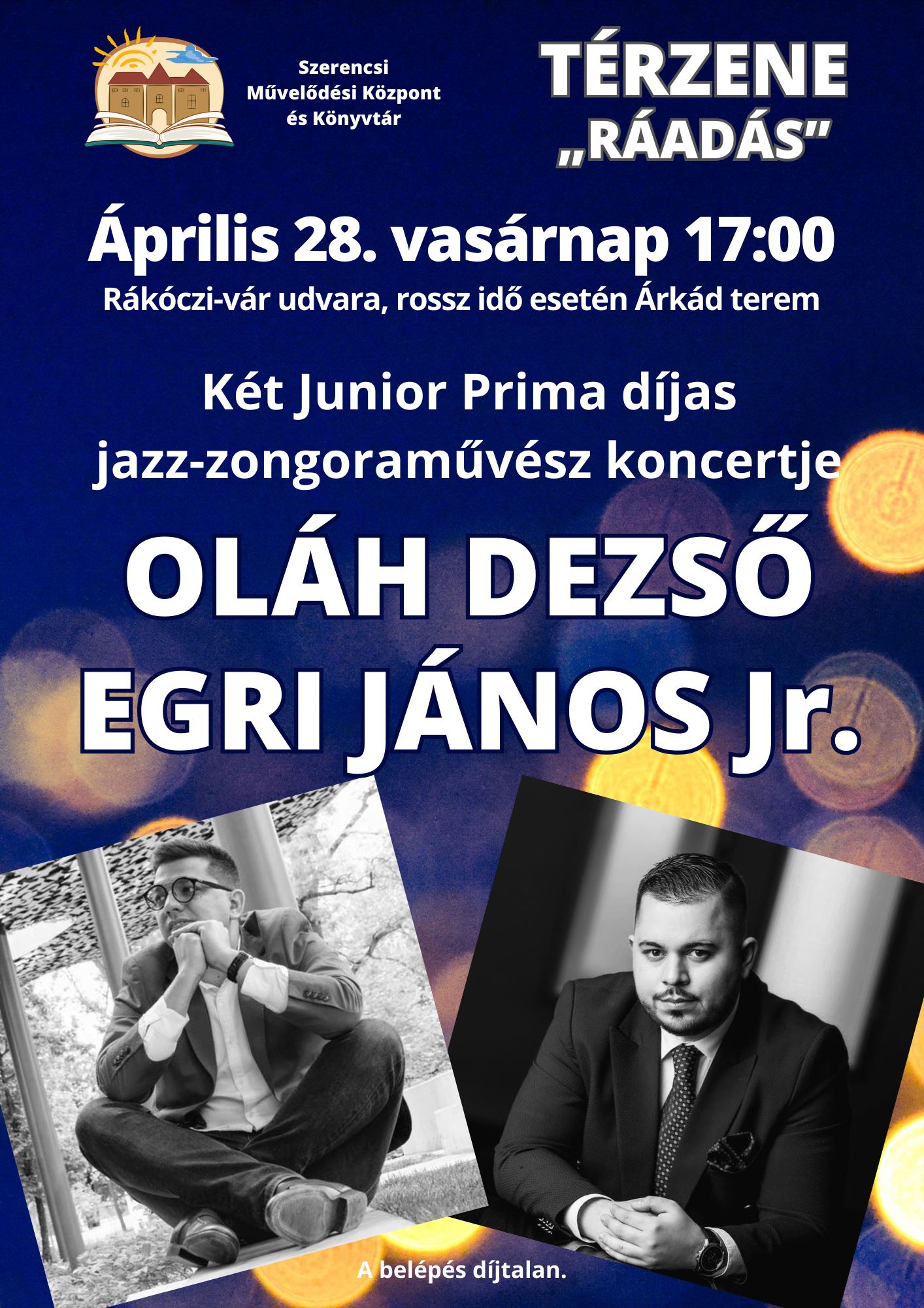 MEGHÍVÓ2024. április 28. vasárnap 17 óraOLÁH DEZSŐ és EGRI JÁNOS Jr.két Junior Prima díjas jazz-zongorista koncertjeRákóczi-vár udvaraRossz idő esetén az Árkád teremben.A belépés díjtalan.