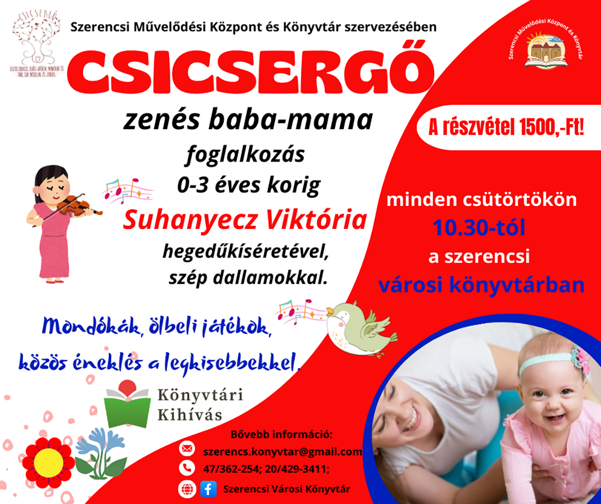 Fontosnak tartjuk, hogy a gyermekek fejlődése minden aspektusból támogatásra kerüljön. Ebből a célból indult tavaly a Csicsergő, némi téli szünet után azonban újult erővel vágunk bele a folytatásba. 2025. március 13-án újraindul a Csicsergő baba-mama klub foglalkozása a Szerencsi Városi Könyvtárban. Ezentúl minden héten csütörtökön 10.30-től várjuk a mamákat és a babákat az ölbéli mondókákkal, versekkel hegedűszó kíséretében.