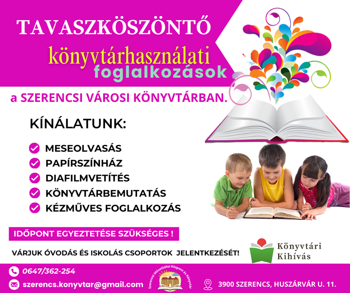Interaktív könyvtárhasználati foglalkozással várjuk a tavaszi hónapokban is az óvodás és iskolás csoportokat a Szerencsi Városi Könyvtárba! Kínálatunkban szerepel a könyvtár bemutatása, használata, meseolvasás és annak feldolgozása, papírszínház, diafilm vetítése és természetesen kézműves foglalkozás.