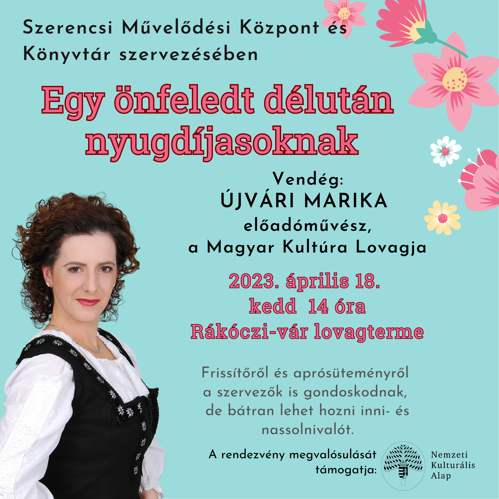 A Szerencsi Művelődési Központ és Könyvtár a város nyugdíjasai számára szervez egy zenés délutánt 2023. április 18-án, kedden 14 órától a lovagteremben. Fellép Újvári Marika előadóművész.