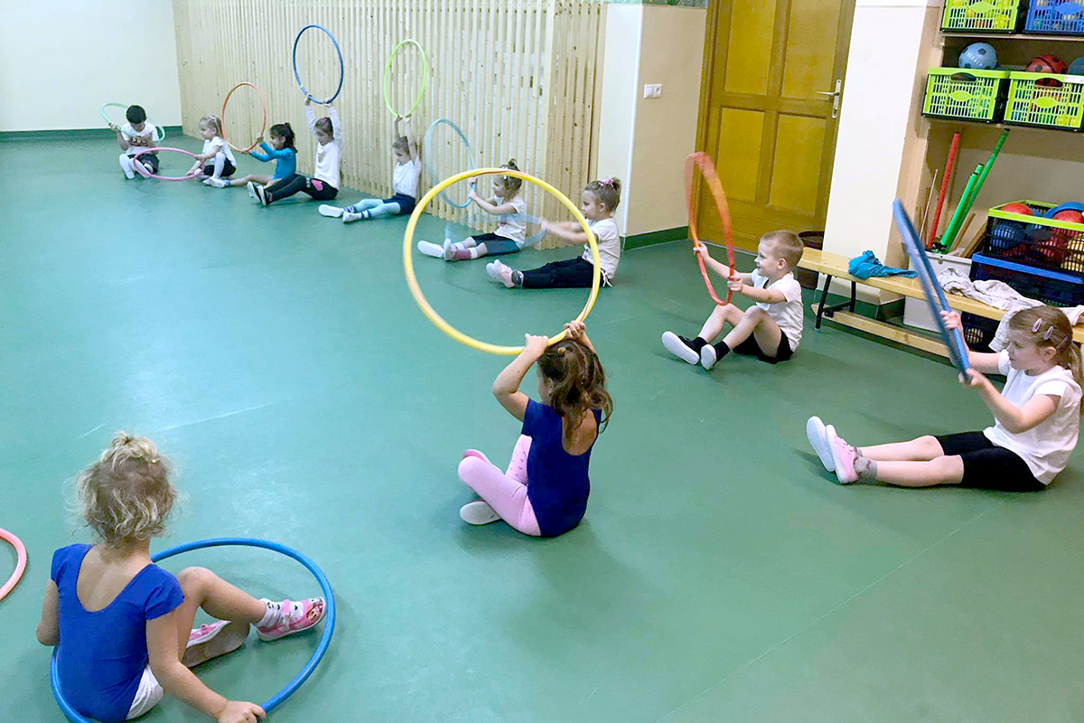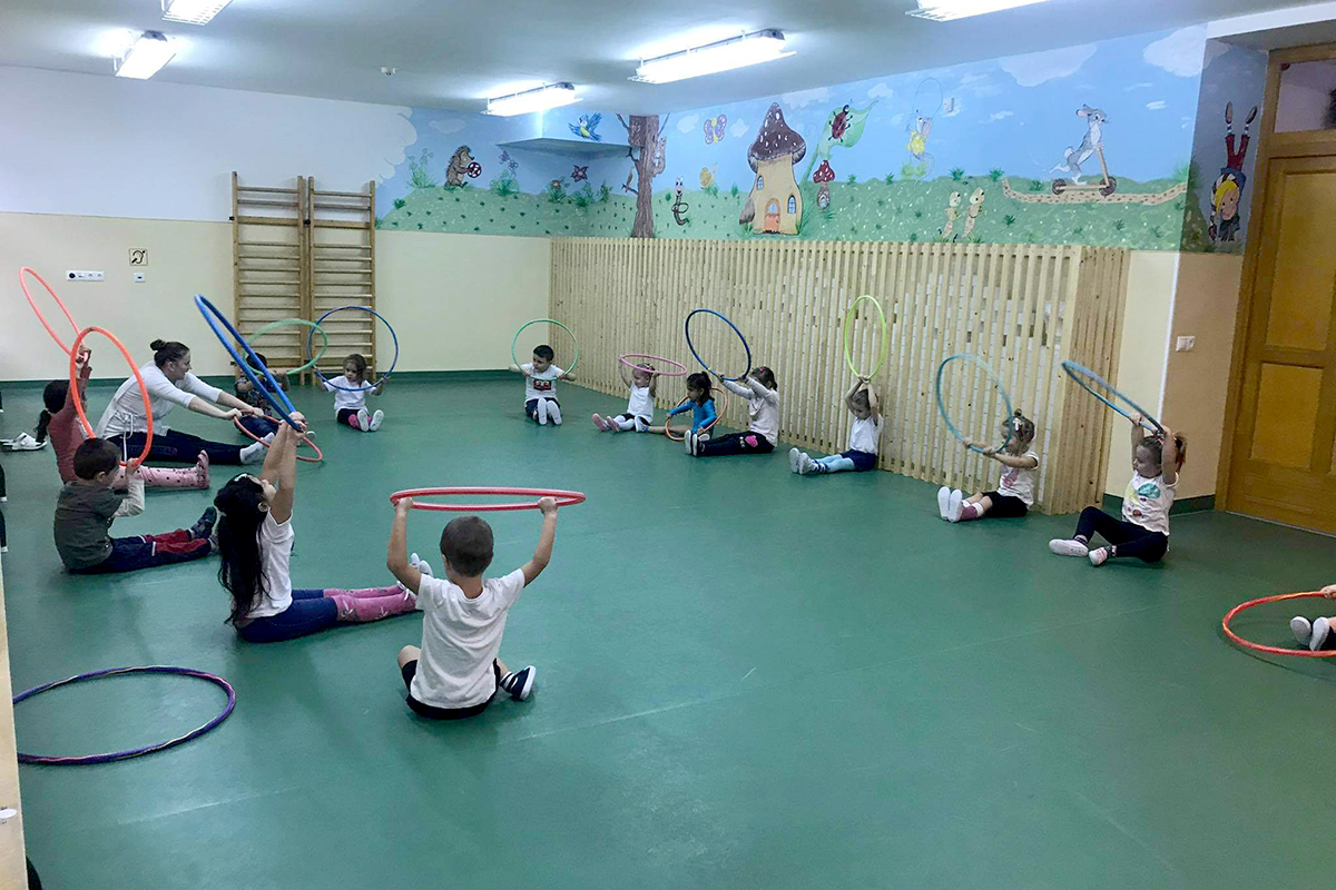 A csoport egyik kedvenc tevékenységi formája a mozgás. Minden héten a tornateremben fejlesztjük a kicsik mozgás koordinációját, változatos, színes eszközökkel. A héten a hullahopp karika volt a tevékenység középpontjában.