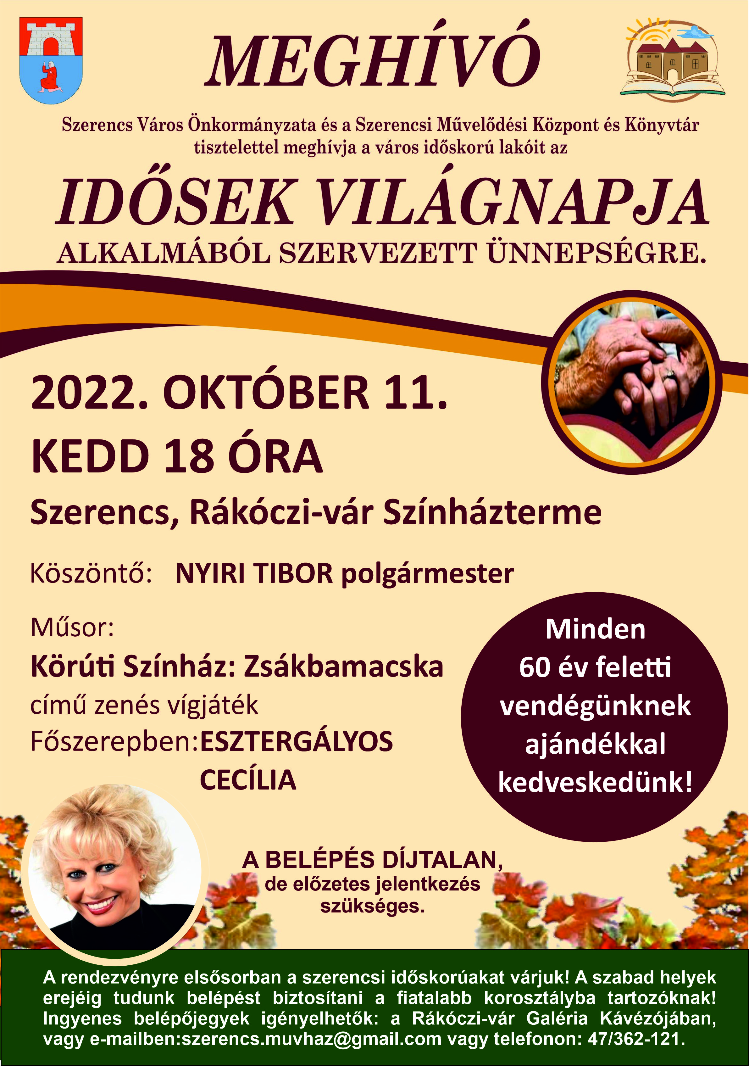 Szerencs Város Önkormányzata településünk idősebb polgárait köszönti az idősek hónapja alkalmából 2022. október 11-én, kedden 18 órától a Rákóczi-vár színháztermében.