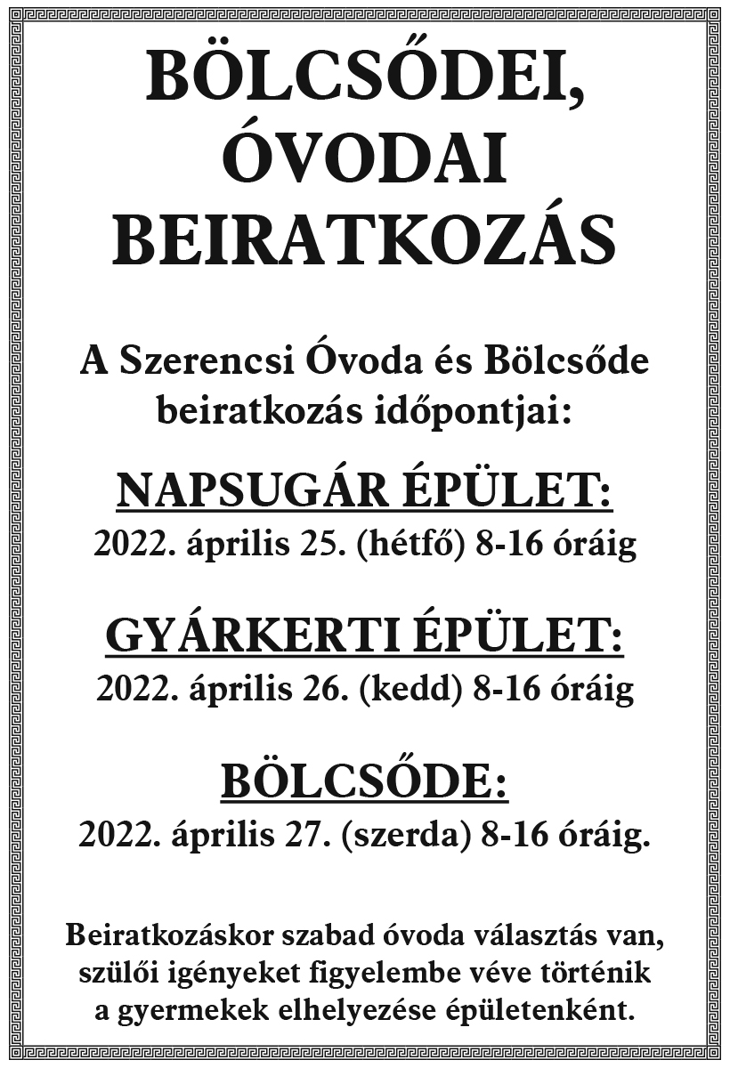 A Szerencsi Óvoda és Bölcsőde beiratkozás időpontjai