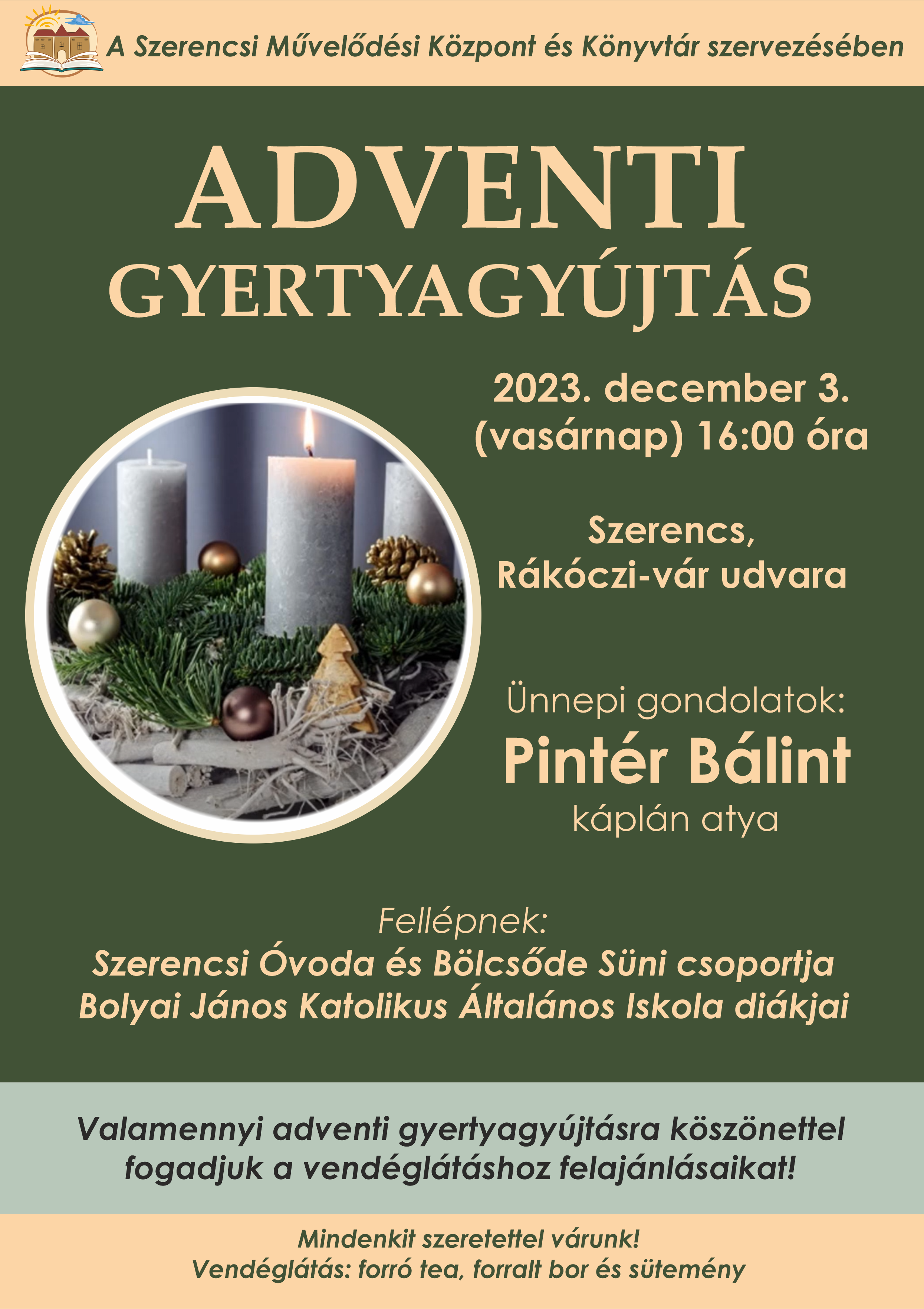Mindenkit szeretettel várunk az első adventi gyertya meggyújtására 2023. december 3-án, vasárnap 16 órakor a Rákóczi-vár udvarán.