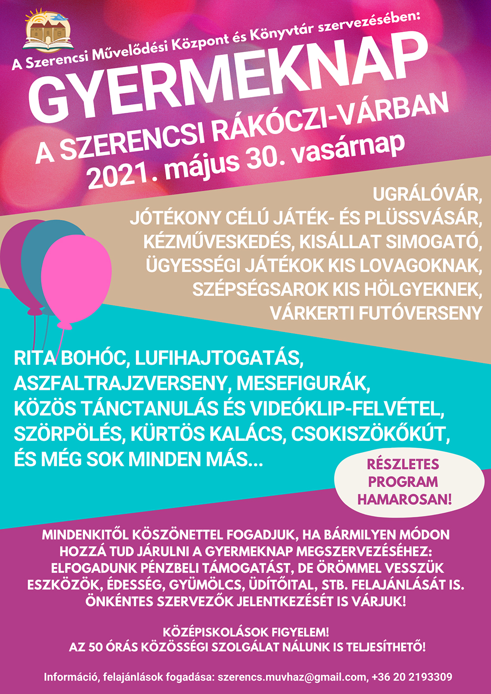 Gyermeknapi programot rendez a Szerencsi Művelődési Központ és Könyvtár 2021. május 30-án, vasárnap 10 órai kezdettel a Rákóczi-várban.