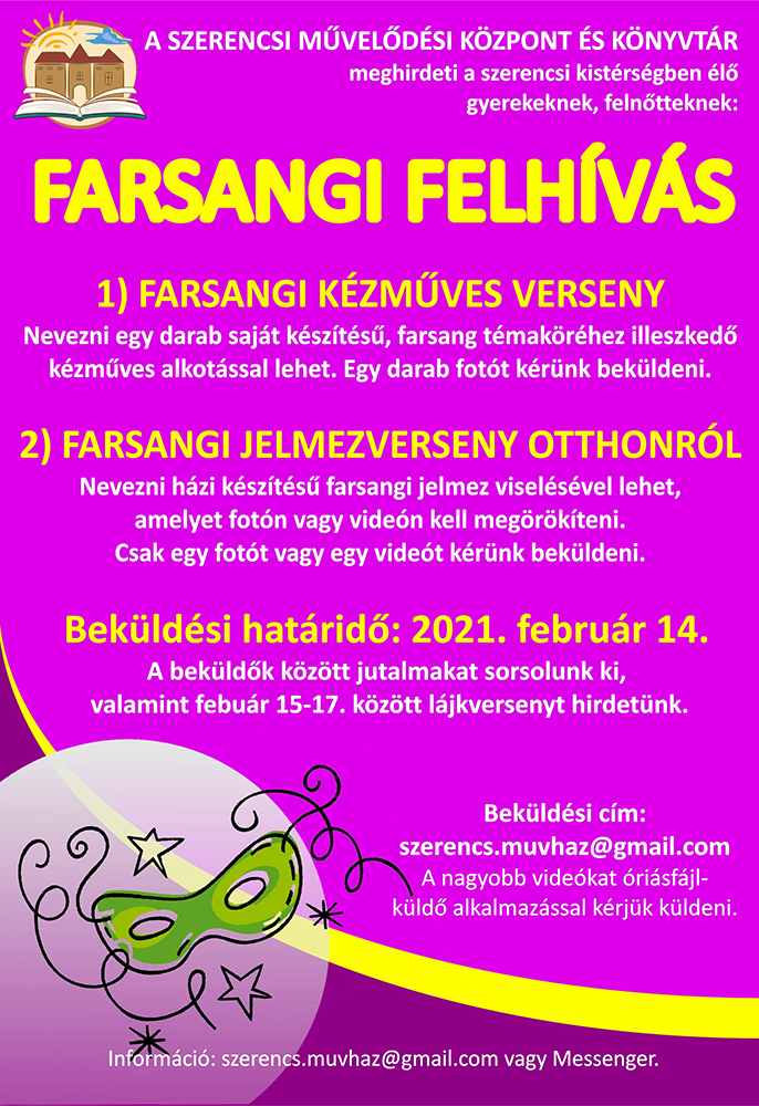 Farsangi felhívást tett közzé a Szerencsi Művelődési Központ és Könyvtár. A szerencsi kistérségben élő gyerekektől, felnőttektől várnak farsanghoz kötődő kézműves alkotásokat vagy farsangi jelmezes fotókat, videókat.