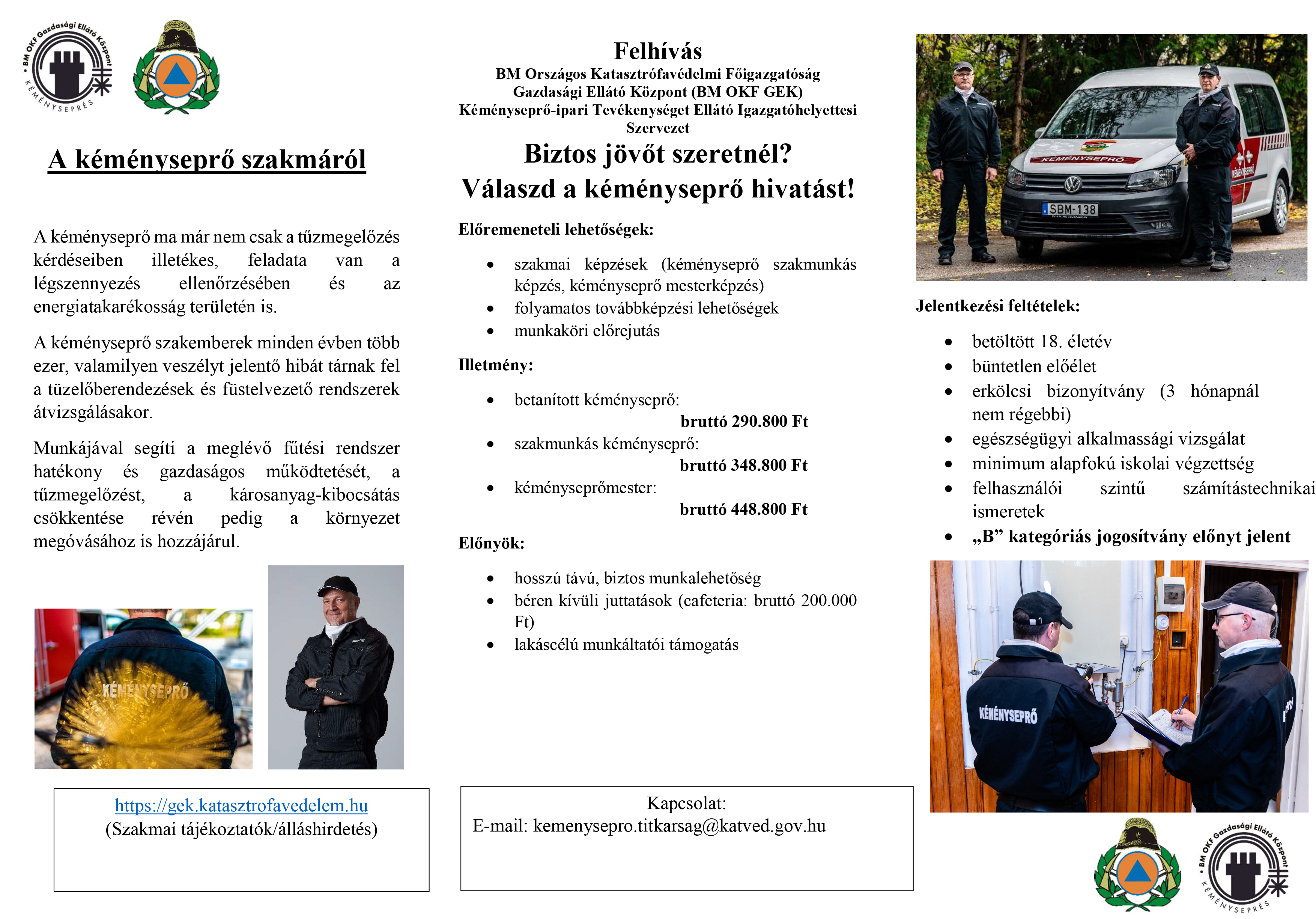 Amennyiben nem rendelkezik kéményseprő végzettséggel, betanított kéményseprők részére ingyenes átképzési lehetőséget biztosítunk. A képzés bentlakásos, és a képzés ideje alatt illetményre jogosult.