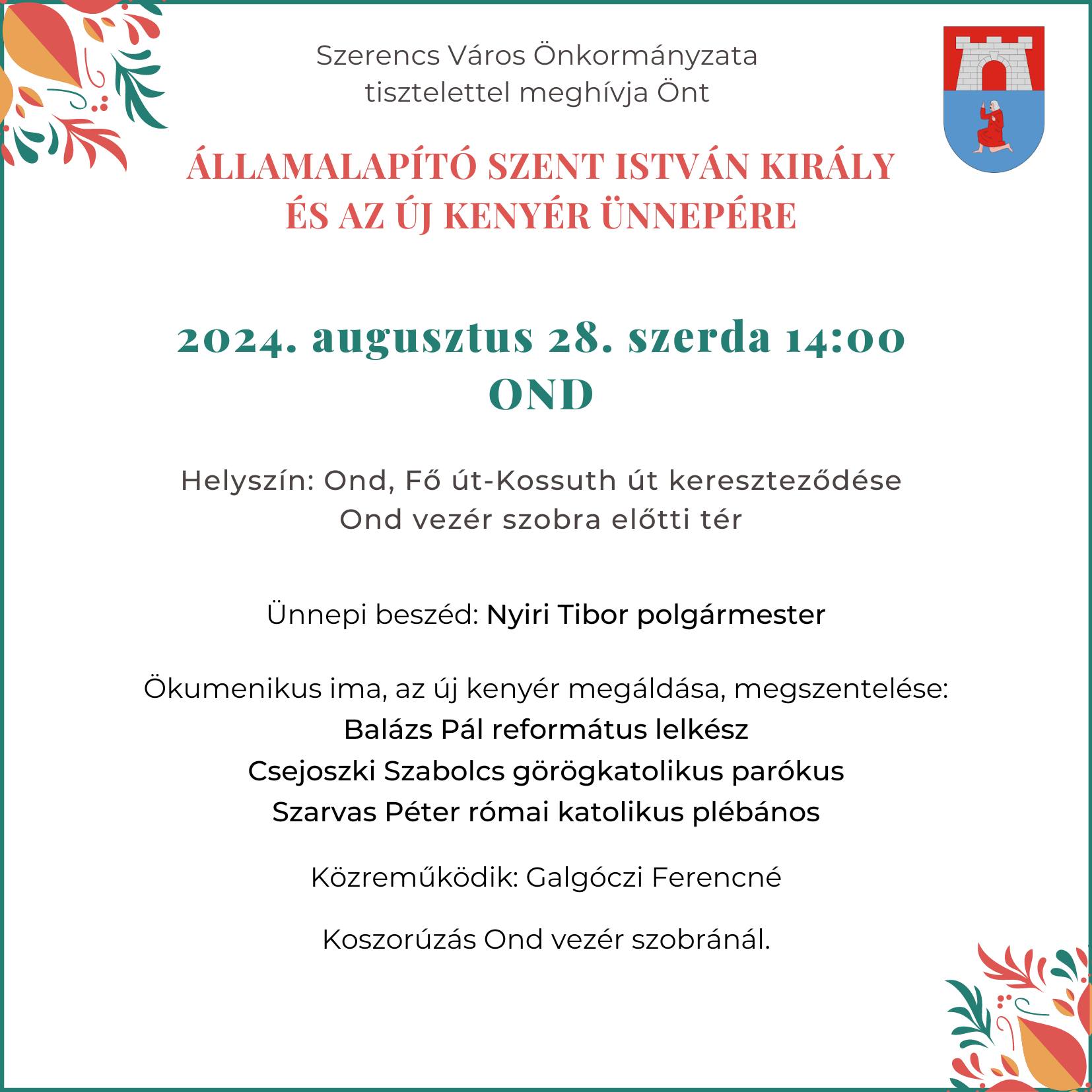 A Szerencsi Művelődési Központ és Könyvtár tájékoztatása szerint a korábban meghirdetett, de a felhőszakadás miatt elmaradt ondi Szent István-megemlékezést és kenyérszentelési ünnepséget augusztus 28-án, szerdán 14 órától tartják Ond vezér szobránál.