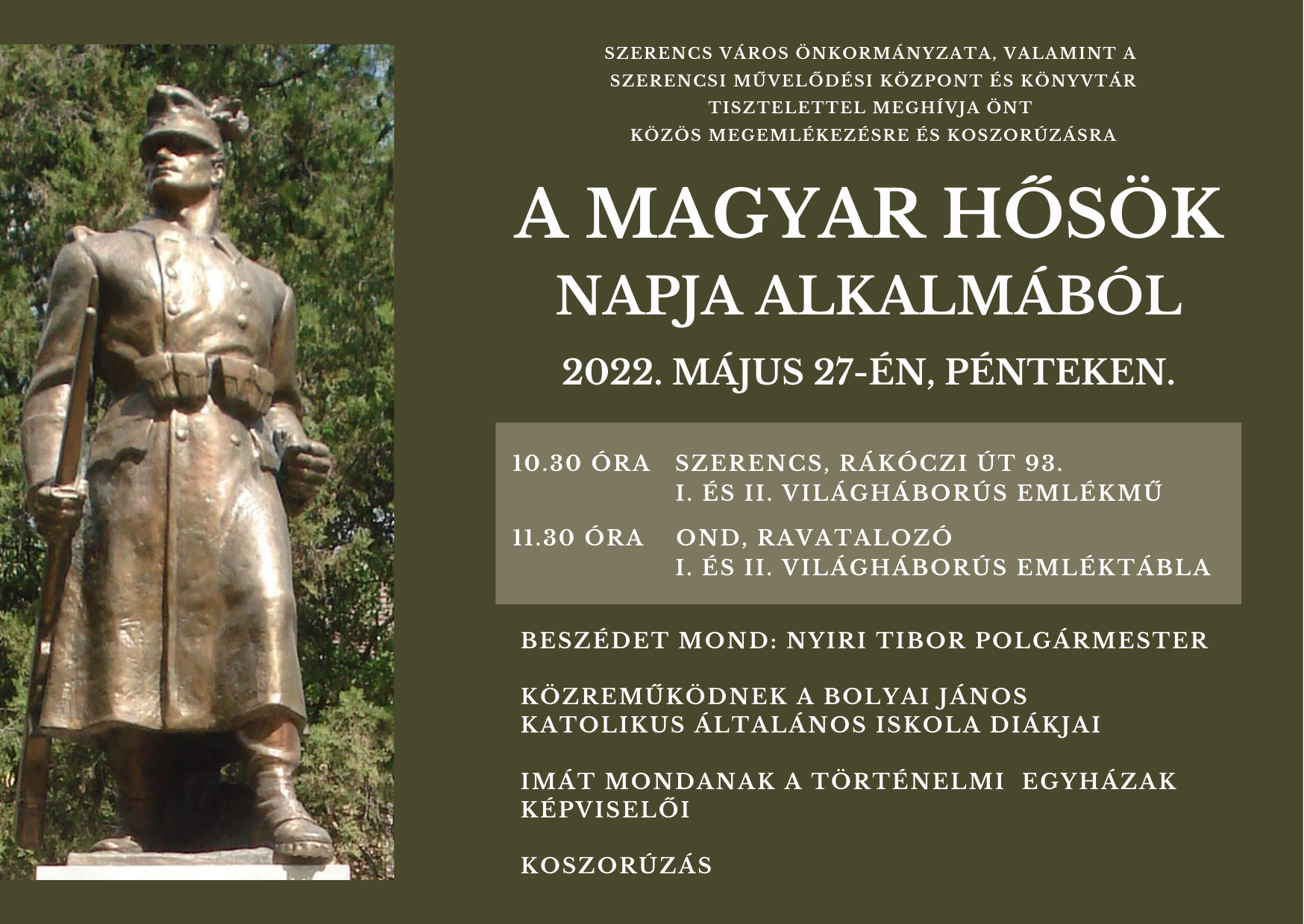 A magyar hősök napja alkalmából megemlékezést és koszorúzást rendez Szerencs Város Önkormányzata 2022. május 27-én, pénteken 10.30 órától Szerencsen az I. és II. világháborús emlékműnél (katonaszobor), valamint 11.30 órától Ondon a ravatalozónál, az I. és II. világháborús emléktáblánál.