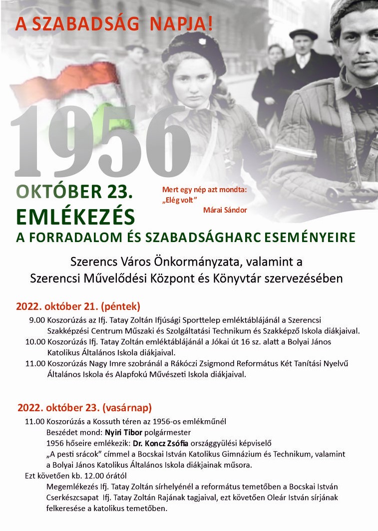 Szerencs Város Önkormányzata, valamint a Szerencsi Művelődési Központ és Könyvtár minden érdeklődőt szeretettel vár nemzeti ünnepünk alkalmából, az 1956-os forradalom és szabadságharc 66. évfordulója tiszteletére rendezett megemlékezésekre és koszorúzásokra 2022. október 21-én és 23-án a szerencsi emlékhelyekhez.