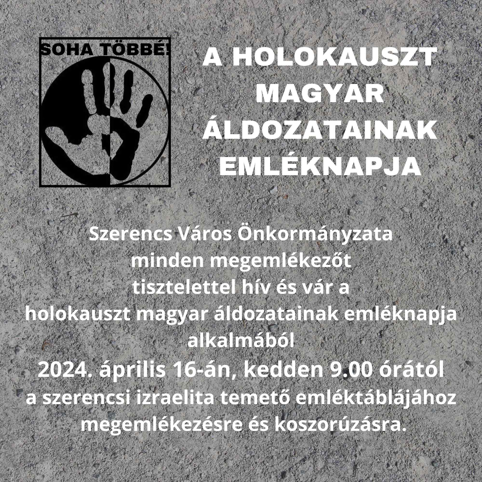 Szerencs Város Önkormányzataminden megemlékezőt tisztelettel hív a holokauszt magyar áldozatainak emléknapja alkalmából 2024. április 16-án, kedden 9 órától a szerencsi izraelita temető emléktáblájához megemlékezésre és koszorúzásra.