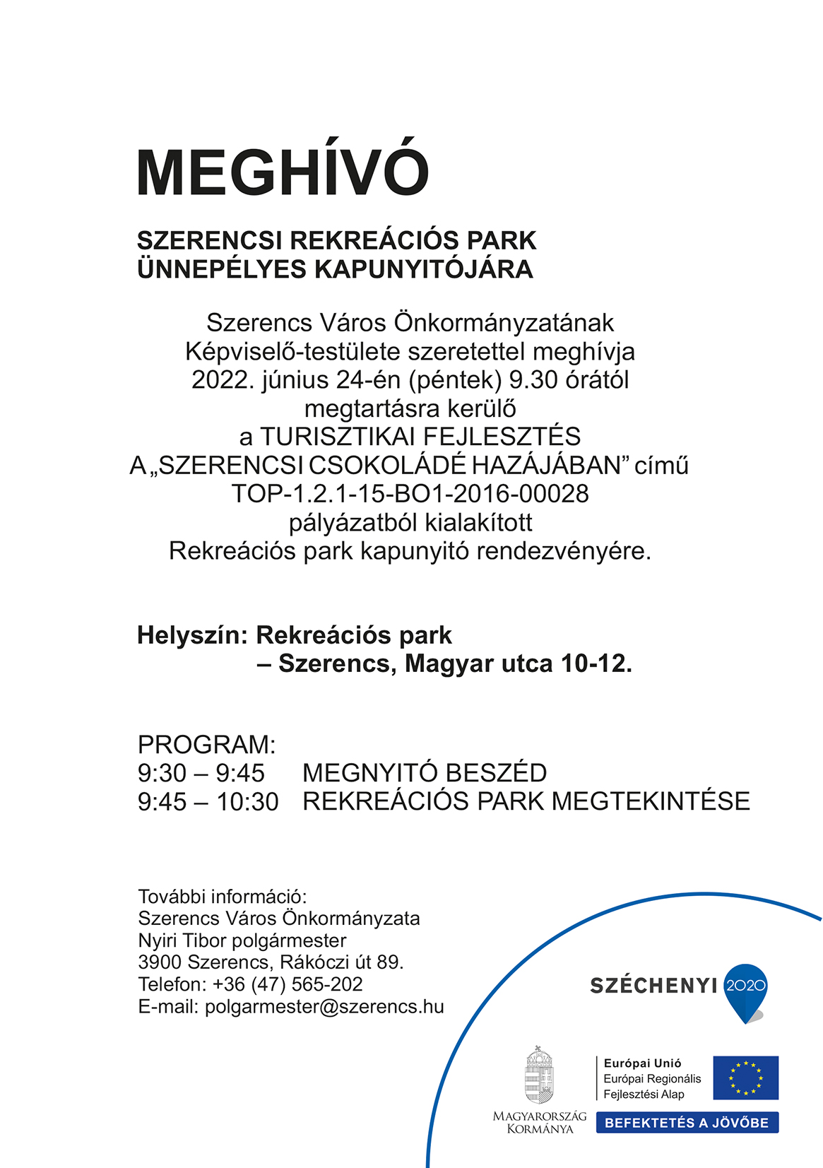 Meghívó Szerencsi Rekreációs park ünnepélyes kapunyitójára