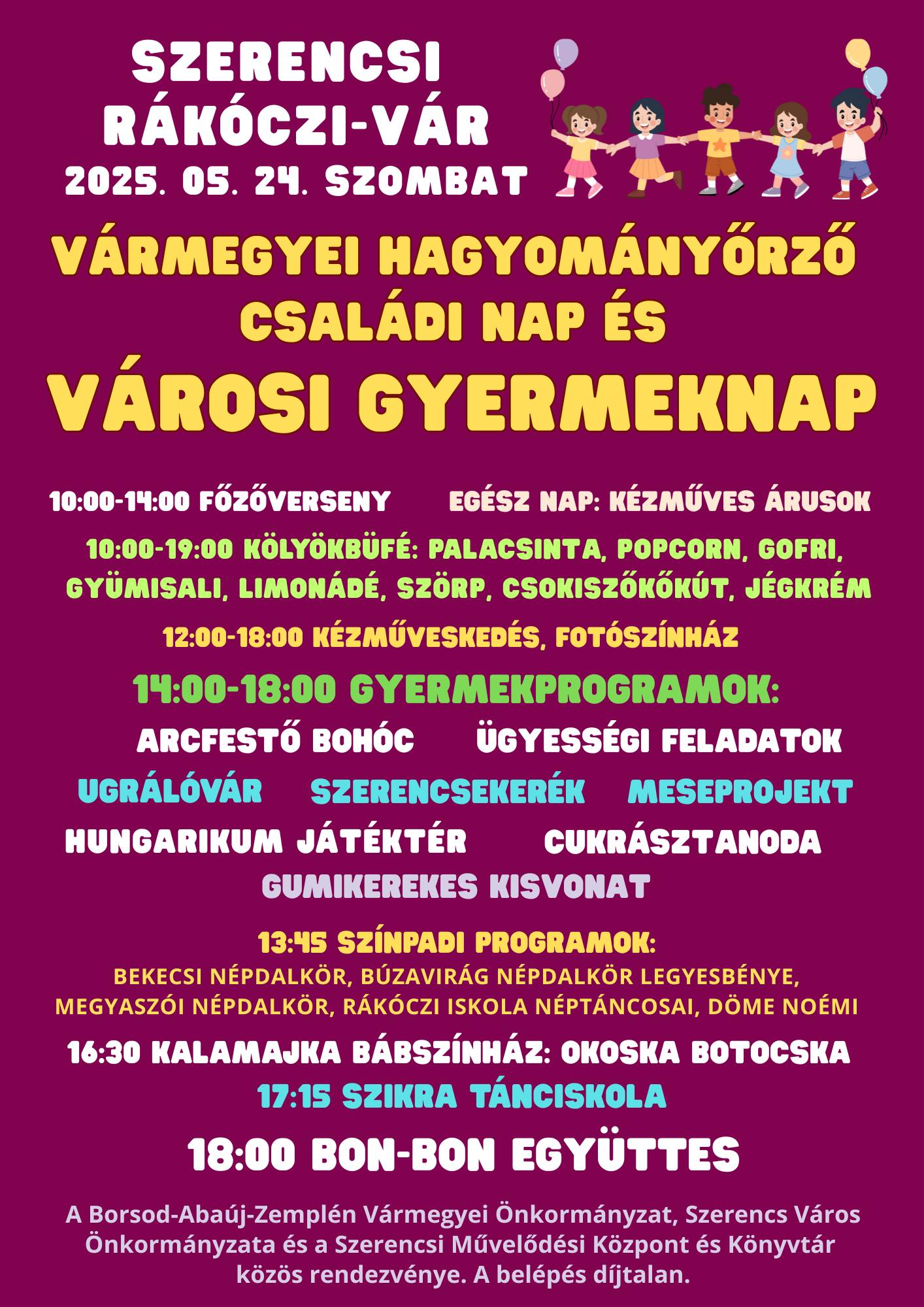 A 2025. évi gyermeknapon is sok aktivitással és finomsággal várjuk a gyerekeket (és felnőtteket) a szerencsi vár udvarán és termeiben. Idén programjainkat közösen szervezzük Borsod-Abaúj-Zemplén vármegye önkormányzatával, akik egy hagyományőrző családi napot hoznak el nekünk, valamint a Nemzeti Művelődési Intézet térségi irodájával, akik meseprojekttel és hungarikum témájú játékokkal szórakoztatják a látogatókat.