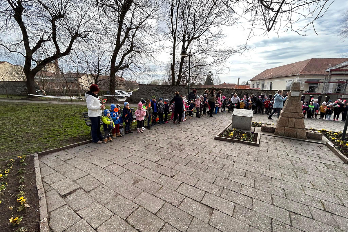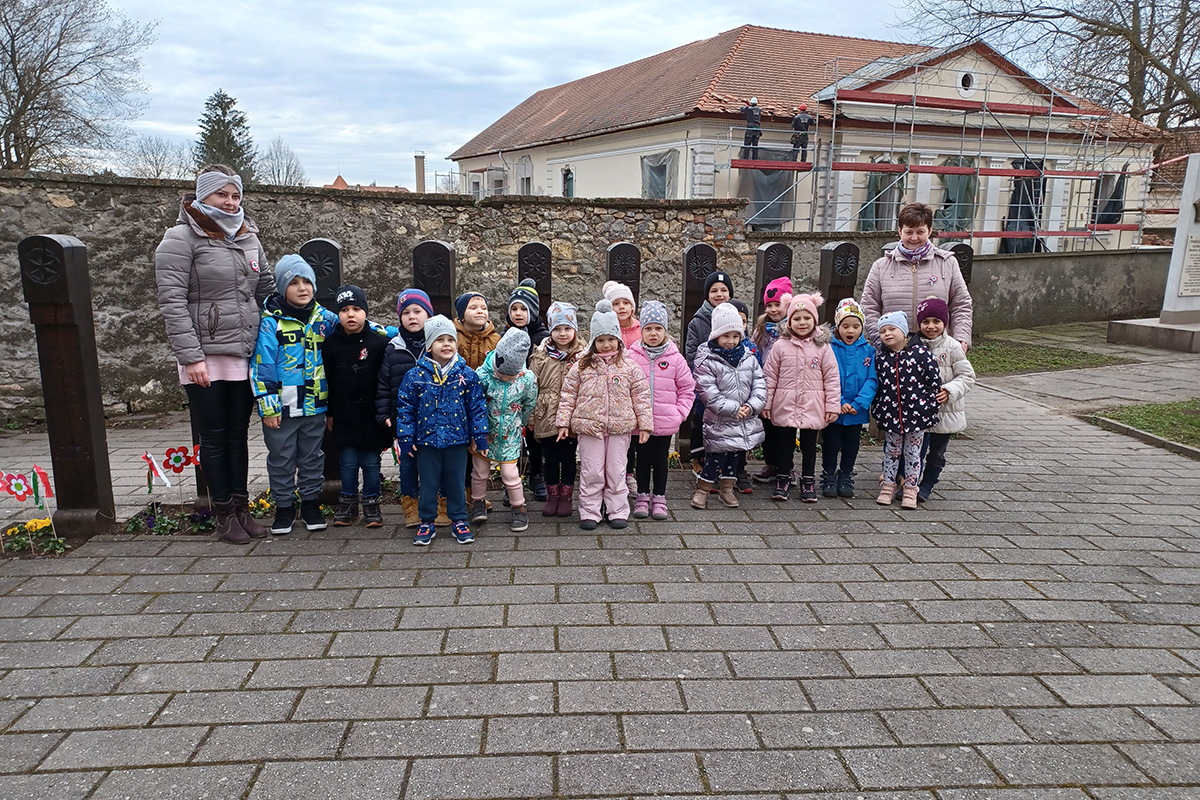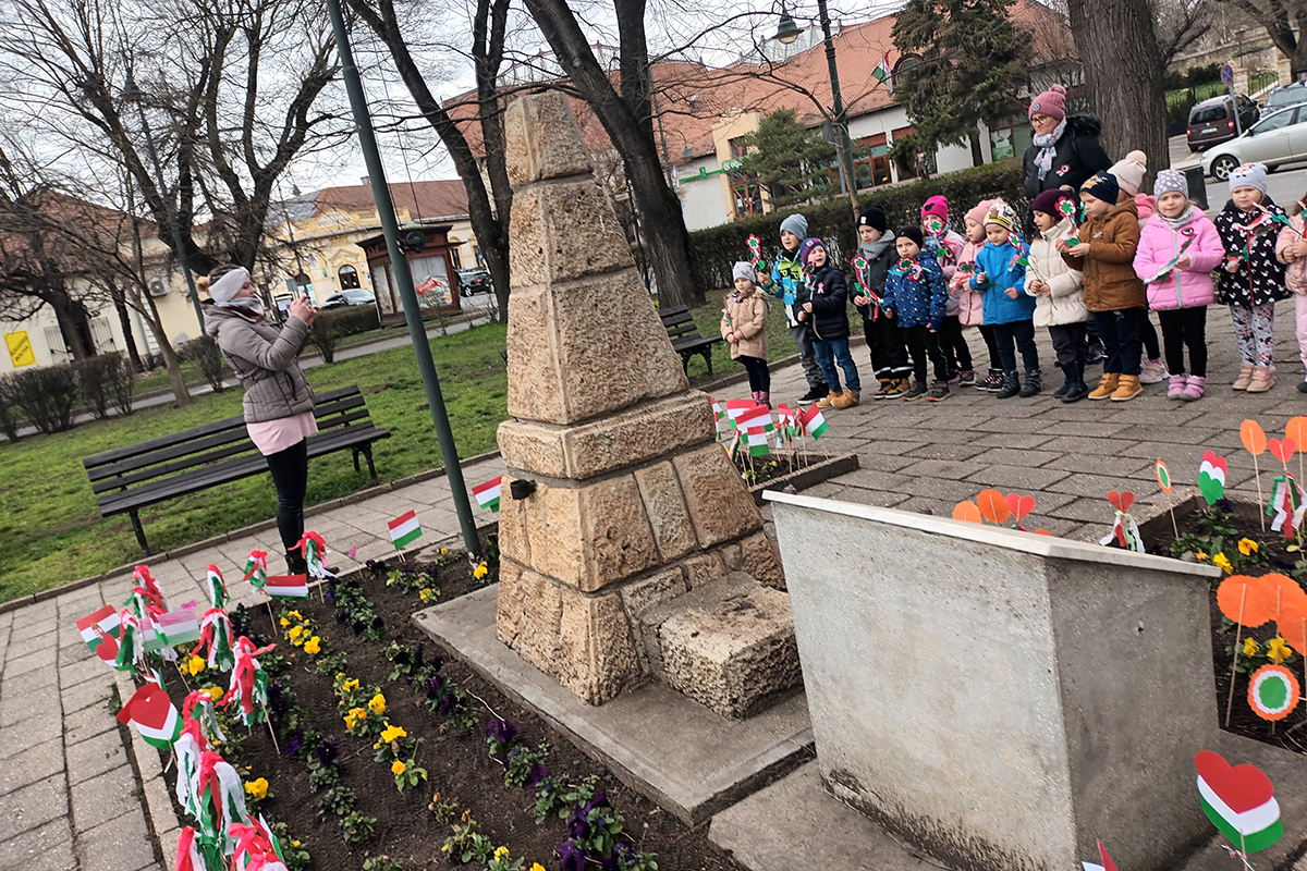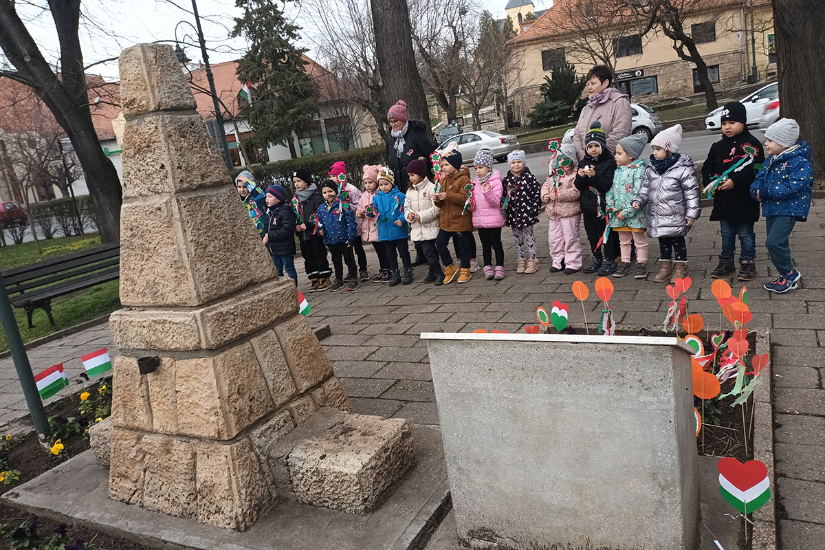 Második programként elsétáltunk a Kossuth térre, ahol minden csoport a gyermekek által készített nemzeti színű jelképet tűzött le az emlékműnél.