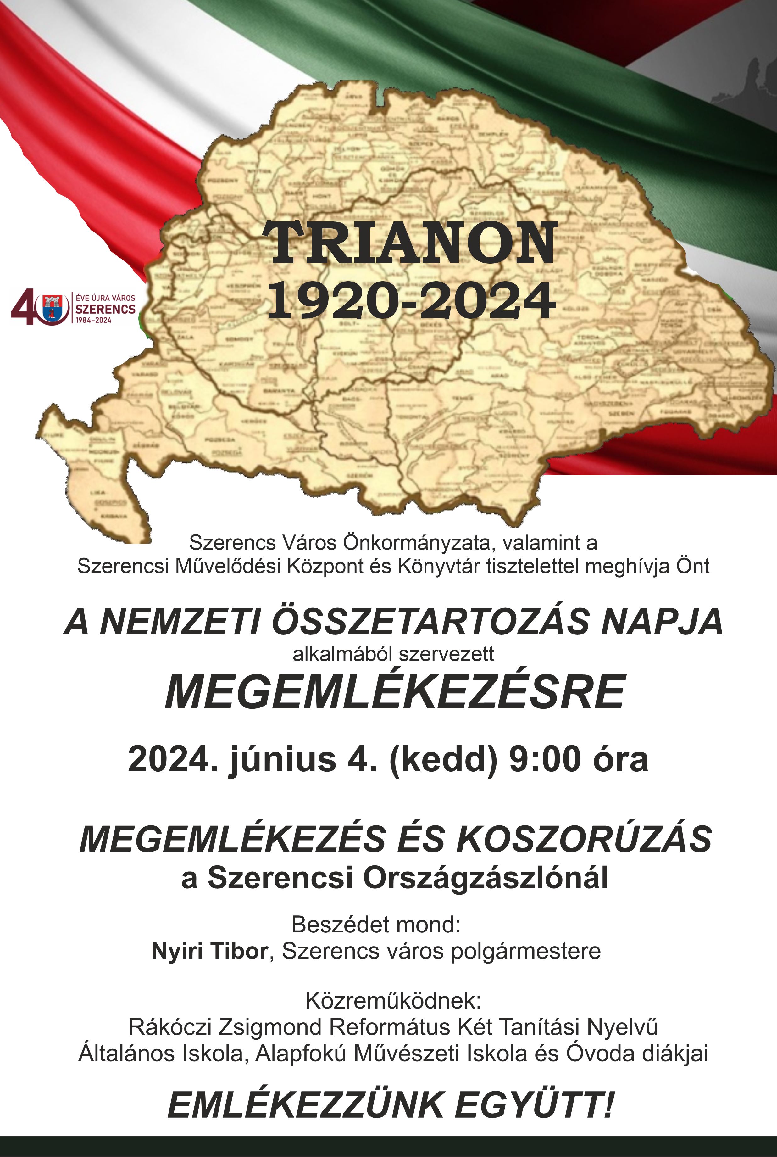 Szerencs Város Önkormányzata a nemzeti összetartozás napja alkalmából megemlékezést és koszorúzást szervez 2024. június 4-én, kedden 9 órától a Szerencsi Országzászlónál (a Szerencsi Polgármesteri Hivatal előtt).