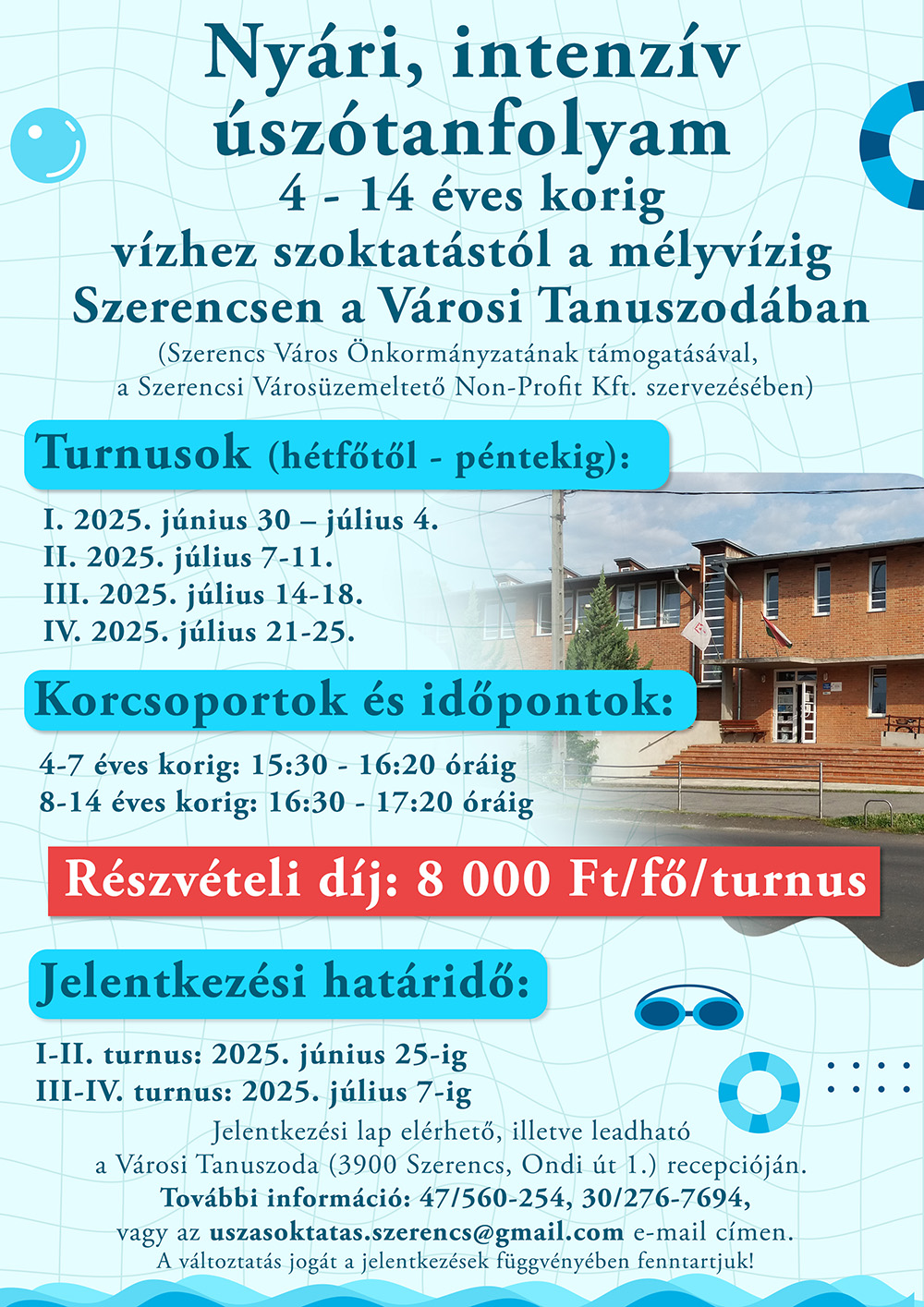 Szerencs Város Önkormányzatának határozott szándéka, hogy a nemrégiben felújított és újra megnyitott Városi Tanuszoda ismét a helyi közösségi élet egyik pezsgő központjává váljon. Ennek érdekében a Szerencsi Városüzemeltető Nonprofit Kft. Kiss Attila polgármester teljes támogatásával mindent megtesz a létesítmény népszerűsítéséért. Elsőként egy megfizethető úszótanfolyamot hirdetnek a 4-14 éves korosztály számára. A plakát tartalmazza a turnusok pontos időpontjait, a jelentkezés feltételeit és módját, valamint a részvételi díjt.