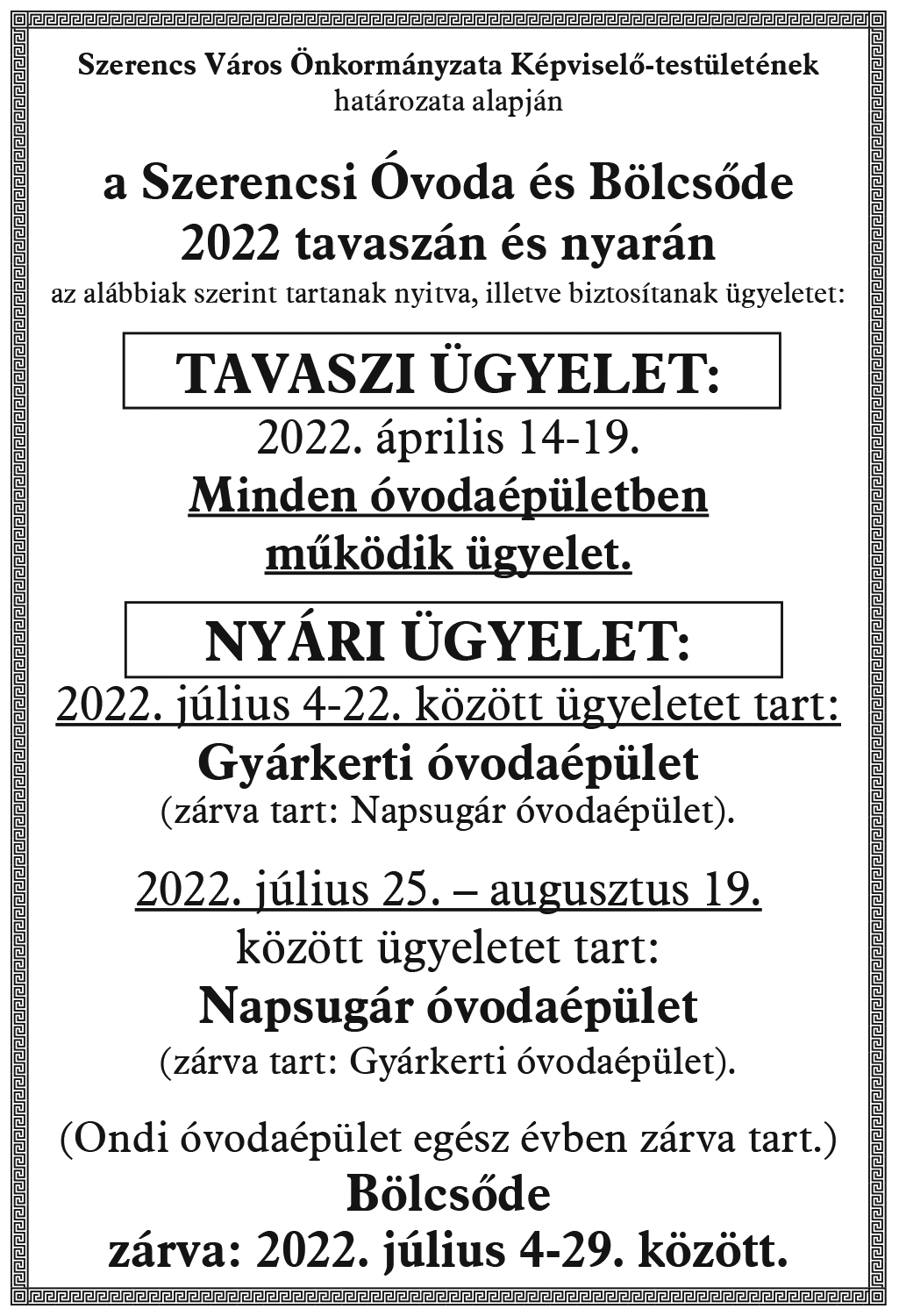 Szerencsi Óvoda és Bölcsőde 2022. évi ügyeleti rendje